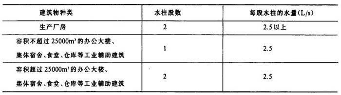 [说明]一般消防用水的供水量,要保证5~40L/s的流量。对工业企业室内消防用水量标准见表4-2-6。