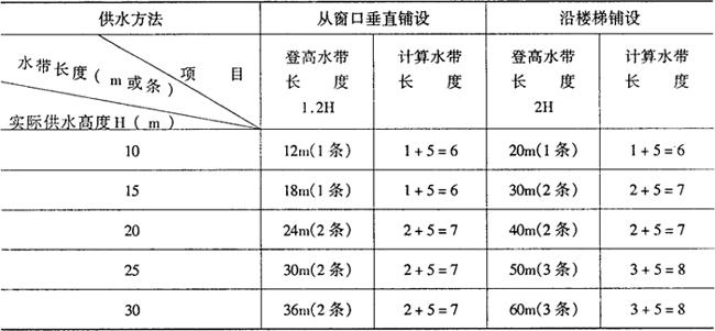 释义 | 消防车供水距离与供水高度 火场供水中,各级指挥员要熟知消防车的供水距离和供水高度,以便在火场供水中灵活运用。 消防车的供水距离与消防车的动力、水泵性能、水带的耐压强度有关。 目前我国生产的消防水带有麻质水带和棉质水带,有胶里水带和锦纶水带。水带的直径分别为90mm、75mm、65mm和50mm(50毫米水带已基本不使用)。工作压力分别为600kPa、800kPa、1000kPa、1300kPa和1600kPa等。各地消防部队装备的水带不尽完全统一,因此消防车的供水距离也很难做到统一标准。但是,根据目前城市消防队实际看,大多数是配备和使用直径65mm麻质水带,其工作压力为1000kPa。我国现行的消防规范中同样是以直径65mm麻质水带为依据。因此,这里还是以直径65mm麻质水带为依据确定消防车的供水距离和供水高度。 (一)使用麻质水带供水距离计算 国产麻质水带的耐压强度一般不超过1000kPa。火场供水中为防止水锤作用使水带破裂,因此,火场上使用的麻质水带实际工作压力不宜超过800kPa。 使用麻质水带时,消防车的供水距离,可按下式进行计算。 解:为了使消防车能长期运转,且考虑麻质水带的耐压强度有限,火场供水中应留有一定的安全系数。因此,消防车出口压力HB值取700kPa。 当有效射程为15m时,口径19mm水枪的喷嘴压力为270kPa,流量为6.5l/s。 直径65mm麻质水带,当流量为6.5l/s时,每条水带(20米)的压力损失为36.3kPa。水源至火场地势平坦,H=0,则 解:消防车水泵流量为13l/s,在消防车内燃机转数一定时,水泵流量增大,压力要相应降低,故消防车出口压力HB值取620kPa,则消防车供水距离为: 解:为使消防车能保证长期运转,出口压力HB采用650kPa。 地势平坦,H=0; 直径75mm麻质水带的阻抗系数S=0.3; 流量为6.5l/s,水枪喷嘴压力为270kPa,则: hd=SQ2=0.3×6.52=12.6kPa 双干线供水距离为9~10条水带长度,如图2-6-28。 利用分水器供水时,消防车的供水距离为5条水带长度,如图2-6-29。 要充分发挥消防车的供水能力,既要有较大的供水距离,又要使消防车供应较大的水量,较优的供水方式是双干线供水。双干线和单干线的供水距离相差不大,但双干线的供水量要大一倍。 在同样大的供水量情况下,双干线供水方式比单干线利用分水器供水方式的供水距离大3.3倍。如图2-6-30。 经过以上计算比较可以看出,当采用直径65mm麻质水带供水时,双干线供水方式最优。特别是在缺水地区或火场离水源较远时,或消防站的消防车数量较少(如县中队),应该在消防车上多配备水带,在火场供水中采取双干线供水方法,发挥消防车的最大供水能力。 (二)使用胶里水带供水距离计算 在我国部分城市消防队中,已经陆续配备胶里水带和锦纶涂胶水带。这类水带的主要特点是耐压强度大、内摩擦阻力小、水带压力损失小,因此,能提高消防车的供水能力。国产胶里水带的耐压强度有1000kPa、1300kPa、1500kPa和1600kPa等规格,后三种属于高压水带。 例:消防车采用直径65mm胶里水带(耐压强度1000kPa)双干线供水,出两支口径19mm水枪扑救室外火灾,有效射程为15m,水源至火场地势平坦。如图2-6-31。试计算消防车的供水距离为多少条水带长度。 解:直径65mm胶里水带阻抗系数为0.35;消防车出口压力仍采用650kPa。地势平坦,H=0;水枪喷嘴压力270kPa。 hd=SQ2=0.35×6.52=14.8kPa 解:CG70/60型水罐消防车属大功率消防车,扬程可达130m,流量为60l/s,消防车出口压力可采用1100kPa。则 这种供泡方法,每支干线混合液流量为13.52l/s,每条直径75mm麻质水带压力损失为54.8kPa,消防车出口压力采用800Pa,则: 即大功率消防车采用75mm麻质水带双干线供应两支PQ16型泡沫枪时的供泡距离为5条水带长度。 2.使用泡沫钩枪的供水距离 泡沫钩管的进口压力为500kPa时,混合液流量为16l/s,采用直径65mm麻质水带双干线并联供应,采用流量平分法,则每支干线流量为8l/s,每条水带压力损失为55kPa,则: 消防车供应泡沫钩枪的供水距离为3条水带长度。 (四)消防车供水高度计算 随著我国经济建设的发展,城市高层建筑日益增多。高层建筑内上下竖井很多(电梯井、管道井、电缆井等),除建筑物的主体结构为非燃烧体外,有大量的可燃物资、设备和装饰装修材料。一旦发生火灾,烟雾大,火势猛,燃烧快。因此,高层建筑起火后,主要立足于室内消火栓和自动喷水灭火系统自救,及时扑灭初起火灾。消防队到场后,应迅速进入著火楼层,使用室内消火栓灭火设备扑救火灾。同时消防车应通过水泵接合器向高层消防给水系统供水,增强室内消火栓给水系统的供水能力。但是,在某些情况下,如室内固定灭火设施发生故障、建筑物火灾较大,固定灭火系统用水量不足时,需要消防队从室外消火栓或其他水源取水,铺设水带干线,出水枪直接扑救高层建筑火灾,以增强室内的供水量或补充室内消防用水量的不足。因此,消防指战员必须了解消防车的供水高度,以便科学地组织指挥高层建筑火灾的供水工作。 根据建筑物的高度不同,火场供水方法可分为常规供水和双干线并联供水。 1.多层建筑的常规供水高度 多层建筑火灾,消防车可采用单干线或双干线一般的常规供水方法,沿楼梯或从窗口外垂直铺设水带,供应楼层灭火用水。这种供水方法叫常规供水。 在多层建筑的常规供水方法中,要保证消防车能长期正常运转。当流量不超过13l/s时,消防车的出口压力可采用750kPa,同时要考虑水带的耐压强度。 (1)采用直径65mm麻质水带时的供
