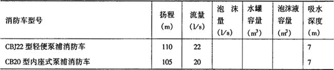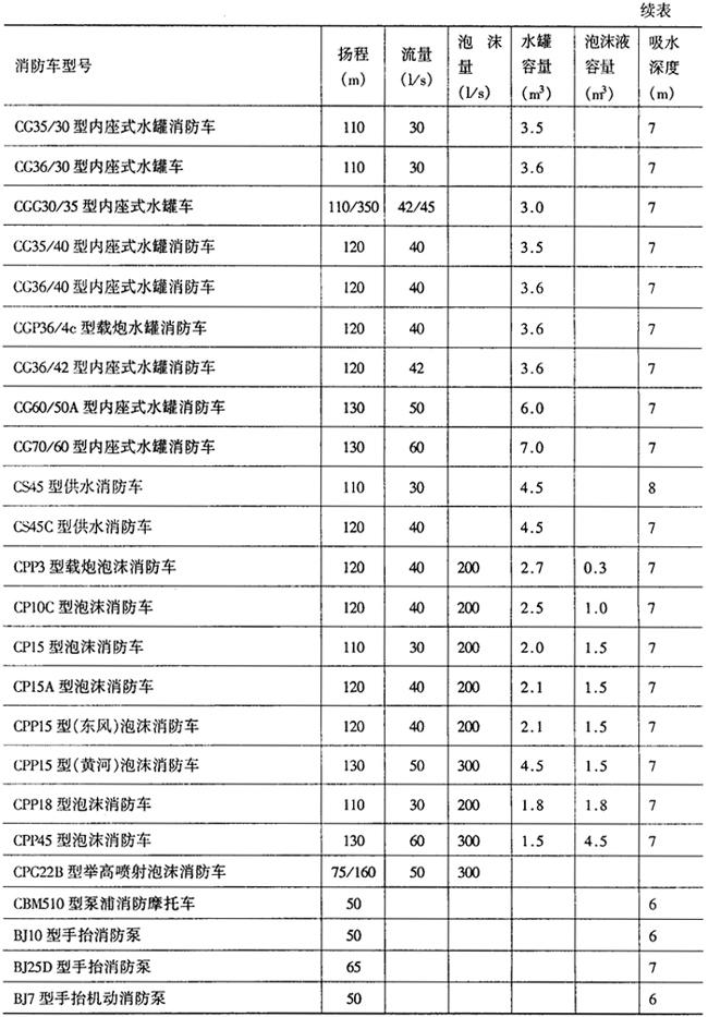 消防车上水泵的原动机是汽车上的内燃机,与固定式电动机带动的消防水泵不同。电动机带动的消防水泵,其转数是恒定的,电动机一经启动就能达到消防水泵标定的压力;内燃机带动的消防车水泵,其转数是可变的,可用控制内燃机的转速调节水泵的转数。因此,消防车上的水泵在最大转数范围内的出口压力,可根据火场需要来调整。 从离心泵的特性曲线可以看出,当消防车内燃机的转数固定时,流量和扬程的变化范围很广。这是离心泵的最大特点,也是离心泵的最大优点。在火场上,当水枪手关闭水枪(流量为零)时,离心泵还能继续工作,而活塞泵就不可能运行。此时,水泵的叶轮使水在泵壳内不断旋转,消耗的机械能转变成热能,使水泵内水温不断升高。所以,水泵不出水长时间运转是不允许的。但为火场供水中水枪手短期关闭水枪转移阵地创造了有利条件。 消防车上的水泵是由汽车内燃机带动的,内燃机的转速可以利用控制油门的大小进行变动。当转数变动时,消防车离心泵的流量、扬程和功率的变化幅度很大。 现在假设转数为n时的流量为Q、扬程为H、功率为N。当转数变为n1时,流量为Q1、扬程为H1、功率为N1。则有:  消防离心泵的转数稍有降低,水泵特性曲线将有明显变化。因此,在火场供水中应注意到消防车内燃机的转数变化时,消防车水泵扬程(压力)亦有很大的变化。 消防车上水泵主要供水性能参数如表2-6-7。 表2-6-7 消防车水泵性能   |