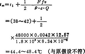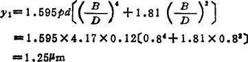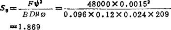 释义 | 液体动压径向滑动轴承的设计计算 计算用名词术语见表4.9-33。滑动轴承的承载量系数S0可根据a、B/D及ε分别由图4.9-3(a=360°)及4.9-4(a=180°)查取。其中的有效角速度ω,外载稳定时,ω=ωs+ωB;外载为随轴回转的离心载荷时,ω=|ωB-ωs|。滑动轴承的摩擦系数f/ψ分别由图4.9-5(a=360°)及4.9-6(a=180°)查取。滑动轴承的承载区油流量系数q1分别由图4.9-7(a=360°)及4.9-8(a=180°)查取。非承载区油流量系数q2,按表4.9-34中的相应公式计算。径向滑动轴承的参数选择见表4.9-36。 表4.9-33 液体动压径向轴承的计算用名词术语 表4.9-34 非承载区油流量系数 ❷ 轴承温升的计算。对于非压力供油径向滑动轴承,可以认为滑动轴承的摩擦生热全部通过轴承体向周围大气散逸,由此得: ❷ 选择轴瓦材料和结构:选用锡基轴承合金ZSnSb11Cu6为轴承衬材料。由表4.9-22查得〔p〕=25MPa,〔pv〕=100MPa·m/s,满足要求。其结构采用置于上端的单油腔入油(表4.9-34中型式4),取 ❸ 确定轴承相对间隙ψ:根据表4.9-35得 ψ=0.8×10-3×v0.25=0.8×10-3×12.570.25=0.0015 ❹ 选择润滑油,确定粘度μ:初步选用L-AN68全损耗系统用油。假定平均温度tm=60℃,先由图4.11-2查得其运动粘度,然后换算出动力粘度为0.024Pa·s。 ❺ 承载量系数: ❻ 求偏心率ε:由S0=1.869及 ❼ 最小油膜厚度:由(4.9-2)式得 hmin=Rψ(1-ε)=60×0.0015(1-0.73)=0.0243mm ❽ 许用最小油膜厚度〔hmin〕:由表4.9-35,取 由于轴刚度大,y2忽略不计,故 能保证完全液体润滑。 ❾ 摩擦系数f:由S0=1.869及B/D=0.8,查图4.9-5得f/ψ=2.8,因而 f=2.8ψ=2.8×0.0015=0.0042 ❿ 润滑油流量Q:由ε=0.73及B/D=0.8。查图4.9-7得q1=0.125。因而 又由表4.9-34得 因而 总油流量为: ⑾ 温升计算:由式(4.9-11)得 ⑿ 修改计算:重新假设润滑油平均温度tm=50℃,重复以上❹ ~⑾计算,可得:μ=0.036Pa·s,S0=1.246,ε=0.66,hmin=30.6μm,f=0.0051,Q1=6.12×10-5m3/s,Q2=0.925×10-5m3/s,Q=7.045×10-5m3/s,tm=48.1~52.1℃。此时与假设值相符。 ⒀ 摩擦功率: Pf=Ffv=48000×0.0051×12.57=3077W ⒁ 选择轴承配合:选用 平均相对间隙: |