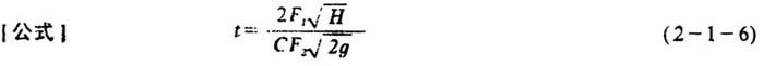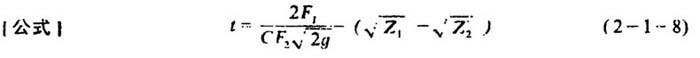 1.液体流空的时间计算 [说明]当上述容器在没有液体补充的非稳定流动情况下,让液体自H液位起,从容器底部或底侧Z2位置小孔流空的时间可用下式计算。   式中 t——时间(s) Z1——开始时液位fm) Z2——小孔位置离基准面的高度(m) F1——容器的横截面积(m2) F,——小孔的截面积(m2) q——重力加速度(9.81m/s2) 2.液体流出一部分的时间计算 [说明]若只须使液体流出总液量的一部分,则所需时间计算如下。见图2-1-1  式中 t——时间(s) Z2——任意停止外流时的液位高度(m) 其它同上 |