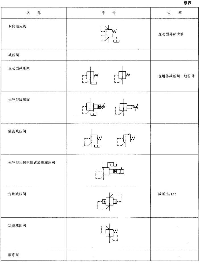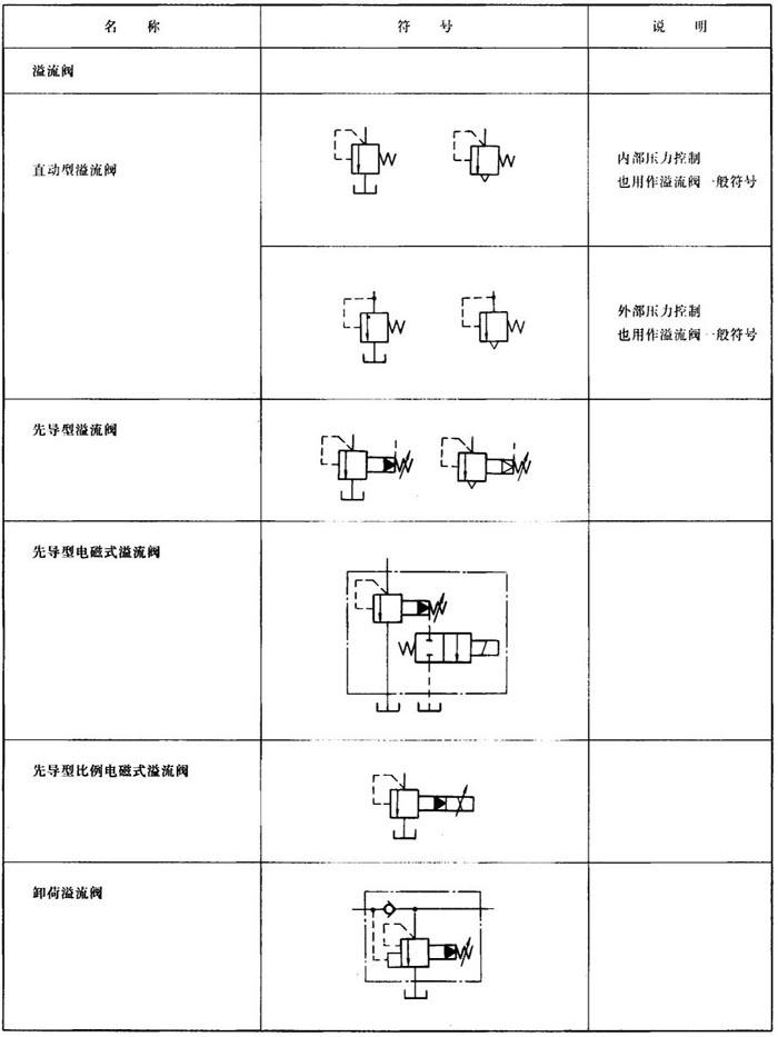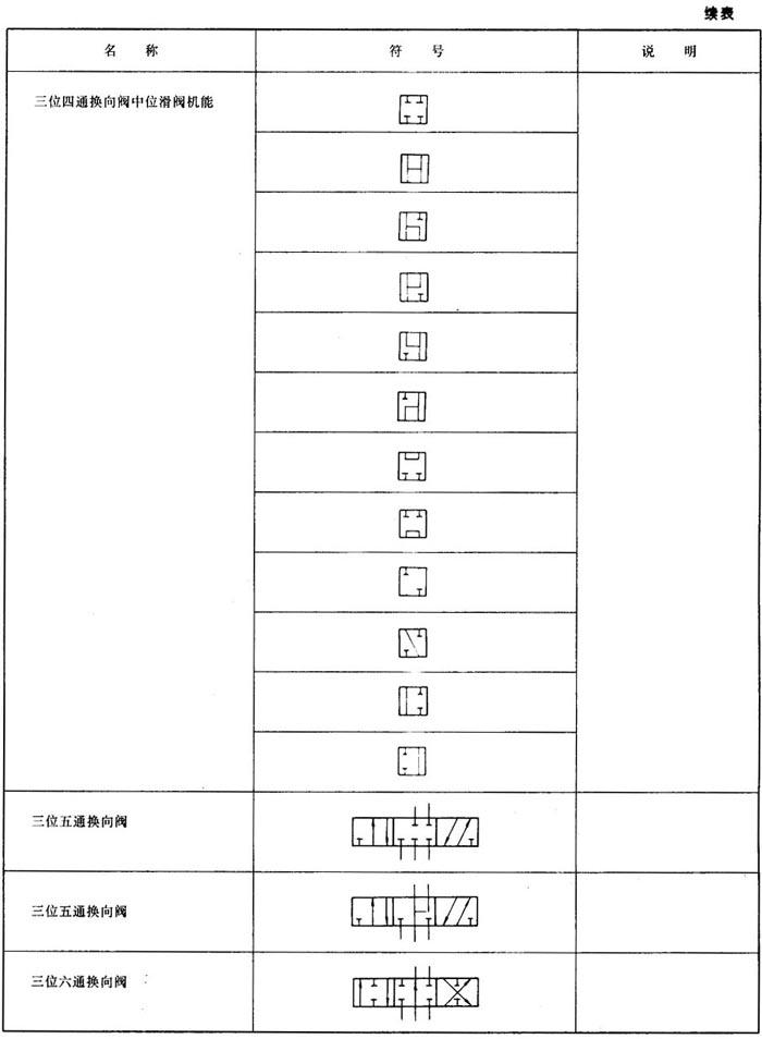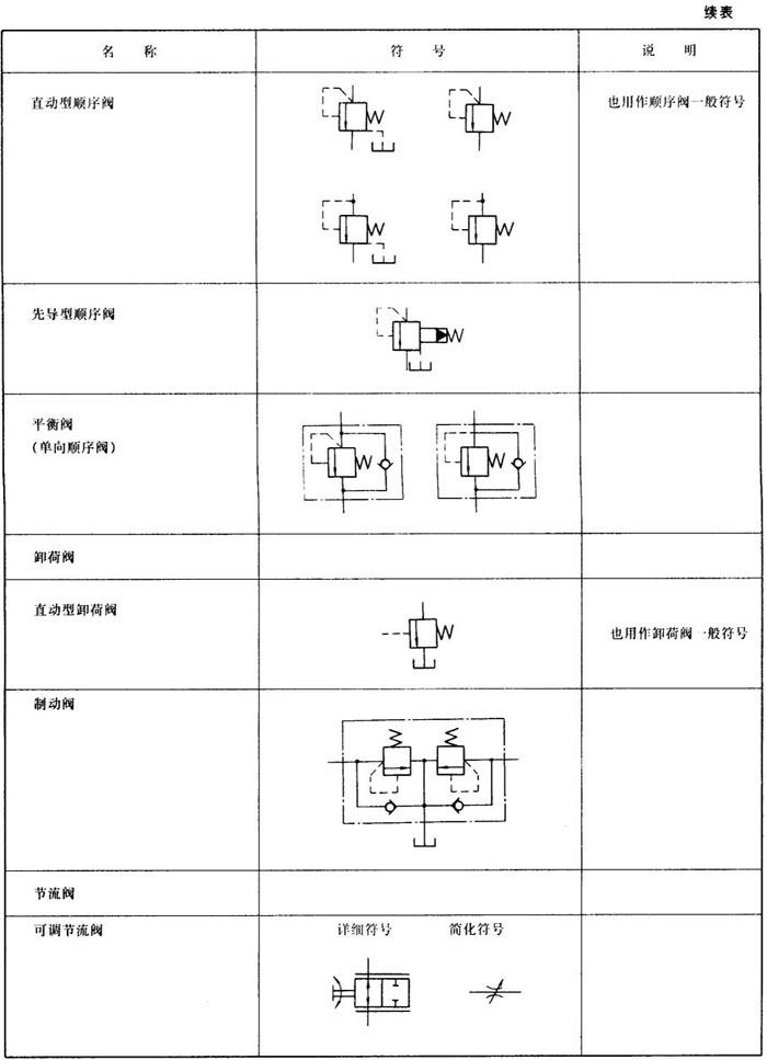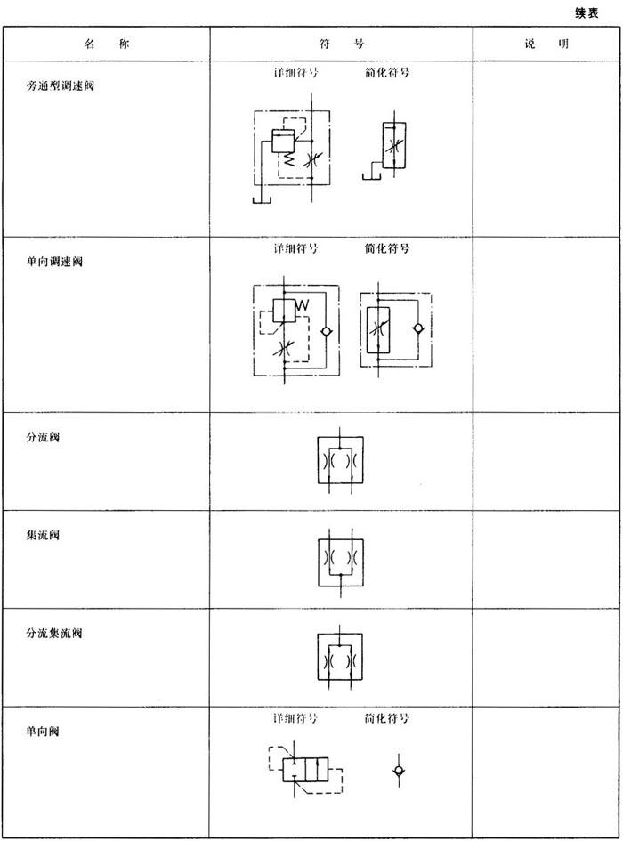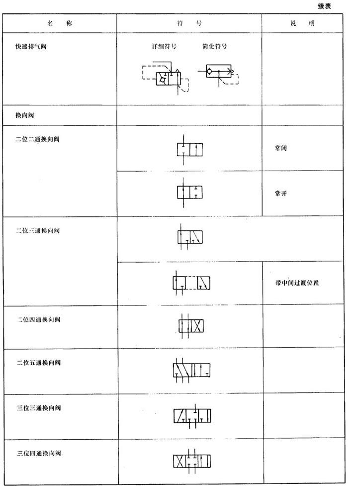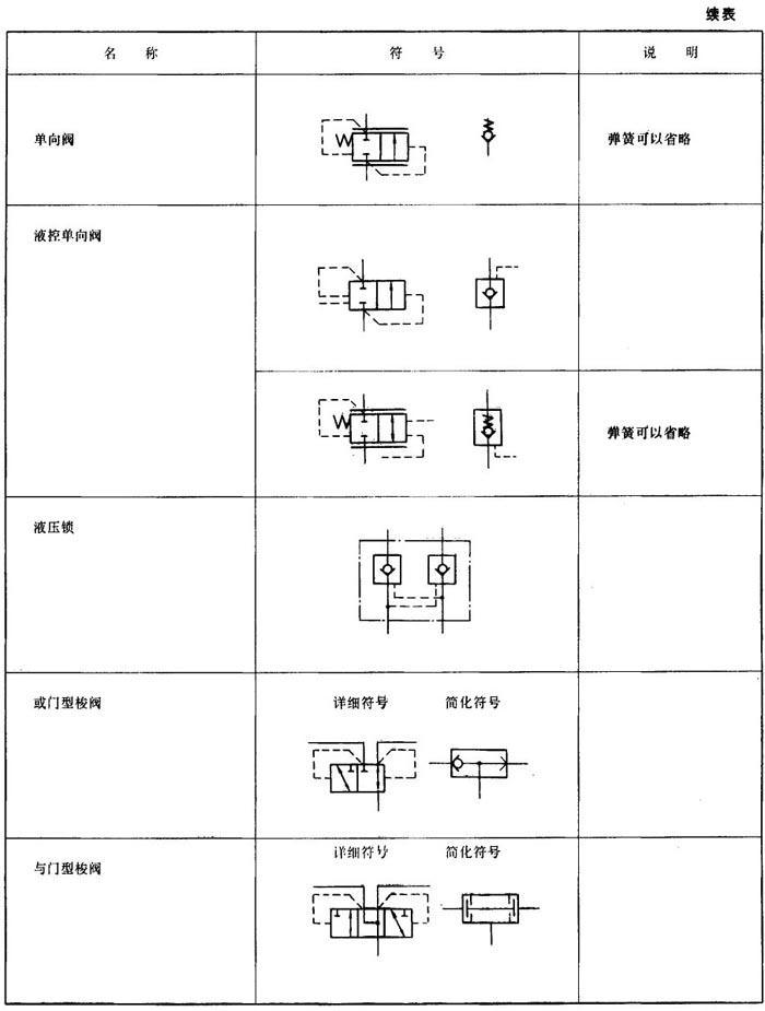 释义 | 液压气动图形符号(摘自GB/T786.1-93) (1)术语 符号要素 用符号来表元(辅)件、装置、流动管路等的种类时所采用的基本图线或图形。 功能要素 用符号来表示元(铺)件、装置的功能或动作时所采用的基本图线或图形。 简化符号 为简化绘图而省略一部分符号或用其他简单符号代替时所采用的符号。 一般符号 没有必要明确表示元(辅)件、装置的详细功能或形式时所采用的代表符号。 详细符号 详细表示元(辅)件功能时所采用的符号。通常与简化符号或一般符号对照使用。 直接压力控制 元件的位置靠控制压力直接控制的方式。 先导控制(间接压力控制)靠元件内部组装的先导阀所产生的压力使主阀动作的控制方式。 内部压力控制 从被控元件内部提供控制用流体的方式。 外部压力控制 从被控元件外部提供控制用流体的方式。 内部泄油 泄油通路接在元件内部的回油通路上,使泄油与回油合流的方式。 外部泄油 泄油从元件的泄油口单独引出的方式。 (2)总则 ·符号只表示元(辅)件的功能、操作(控制)方法及外部连接口,不表示元(辅)件的具体结构和参数、连接口的实际位置和元(辅)件的安装位置。 ·符号均表示元(辅)件的静止位置或零位置。当元(辅)件组成系统,其动作另有说明时,可作例外。 ·除特别注明的符号或有方向性的元(辅)件(如油箱、仪表等)符号外,符号在系统图中可根据具体情况水平或垂直绘制。 ·本标准未列入的图形符号,可根据本标准规定的符号绘制规则和符号例进行派生。当无法直接引用或派生时,或有必要特别说明系统中某一元(辅)件的结构及动作原理时,可局部采用结构简图来表示。 ·除规定者外,符号的大小以清晰美观为原则,绘制时可根据图纸幅面的大小酌情处理,但应保持图形本身的适当比例。 (3)符号构成 符号由符号要素和功能要素构成。 A.符号要素(见表7.3-1的规定) 表7.3-1 符号要素 ·表示可调节元件的可调节箭头可以延长或转折,与控制机构符号相连。如图7.3-2。 ·双向控制的控制机构符号,原则上只需绘制一个,如图7.3-3(a)。在双作用电磁铁控制符号中,如必须表示电信号和阀位置关系时,不采用双作用电磁铁符号如图7.3-3(b),而采用两个单作用电磁铁符号如图7.3-3(c)。 复合控制机构符号 ·单一控制方向的控制符号绘制在被控符号要素的邻接处。 ·三位或三位以上阀的中间位置控制符号绘制在该长方形内边框线向上或向下的延长线上。如图7.3-4。 ·在不被误解时,三位阀的中间位置的控制符号也可以绘制在长方形的端线上。如图7.3-5。 ·压力对中时,可以将功能要素的正三角形绘制在长方形端线上。如图7.3-6。 ·先导控制(间接压力控制)元件中的内部控制管路和内部泄油管路,在简化符号中通常可省略。如图7.3-7。 ·先导控制(间接压力控制)元件中的单一外部控制管路和外部泄油管路仅绘制在简化符号的一端。任何附加的控制管路和泄油管路绘制在另一端。元件符号,必须绘制出所有的外部连接口。如图7.3-8。 ·选择控制的控制符号并列绘制。必要时,也可绘制在相应长方形边框线的延长线上。如图7.3-9。 ·顺序控制的控制符号按顺序依次排列。如图7.3-10。 (B)能量控制和调节元件符号绘制规则 ·能量控制和调节元件符号由一个长方形(包括正方形,下同)或相互邻接的几个长方形构成。如图7.3-11。 ·流动通路、连接点、单向及节流等功能符号,除另有规定者外,均绘制在相应的主符号中。如图7.3-12。 ·外部连接口,如图7.3-13所示,以一定间隔与长方形相交。两通阀的外部连接口绘制在长方形中间。 ·泄油管路符号,绘制在长方形的顶角处,如图7.3-14所示。旋转型能量转换元件的泄油管路符号绘制在与主管路符号成45°的方向,和主符号相交。 ·过渡位置的绘制,如图7.3-15所示,把相邻动作位置的长方形拉开,其间上下边框用虚线连接。 ·具有数个不用动作位置及节流程度连续变化的过渡位置的阀,如图7.3-16所示,在长方形上下外侧画上平行线来表示。 为便于绘制,具有两个不同动作位置的阀,可用表7.3-17的一般符号表示。其间,表示流动方向的箭头应绘制在符号中。 表7.3-17 (C)旋转方向和控制位置关系 必须表示旋转方向和控制位置关系时,控制位置的标注表示在同心箭头的顶端附近。 两个旋转方向的控制特性不同时,在旋转方向的箭头顶端附近分别表示出不同特性的标注。 (D)符号例 符号例见表7.3-18。 表7.3-18 C常用液压气动元件图形符号 (A)常用泵、马达和缸图形符号 常用泵、马达和缸图形符号见表7.3-19。 表7.3-19 (B)常用控制阀图形符号 常用压力控制阀、流量控制阀、方向控制阀等图形符号见表7.3-20 表7.3-20 |
