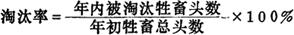 释义 | 淘汰率 淘汰率是指年内畜群中被淘汰的牲畜头数与年初牲畜总头数之比。 及时、合理地进行牲畜的淘汰,提高畜群质量,是加速畜群扩大再生产的重要措施。牲畜的淘汰率应根据牲畜的类别和畜群的生产方向不同来定,在其他条件不变的情况下,牲畜淘汰率与后备牲畜的数量成正比,与其本身使用期限成反比。计算公式是: |