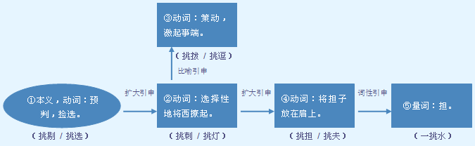 释义 | ![]() 用细长的东西的一头把别的东西举起或弄起;用细长或有尖的东西拨。能重叠。常作带宾、带补谓语。 棍子上~着一挂鞭炮|杆子上~了一长串灯笼|用树枝把蛇~上来|把这堆烂草~到路边去|她用竹竿~起窗帘往外看|姐姐用针从我手指上~了一根刺出来|绳子掉在水里了,请帮我~~。 汉字的一种笔画,由左下向右上方斜,形状是“㇀”。可作宾语、主语、定语等成分。 “刀”字左边是撇,不是~|提手旁的那一~写得很有力|~的写法是由左下方向右上方斜。 【词语】 挑灯 挑逗 挑花 挑唆 【注意】 另见tiāo。 ❶挑选,选择。用于口语。能重叠。 a.作带宾、带补谓语。 我在书店里~了两本专业书|老妈妈~了个好女婿|~了半天才~出来,他还说~得不好|东~~,西~~,还是没有~到满意的|在这家商店买东西,顾客们可以随意~。 b.作心理活动动词的宾语。 你喜欢~,你就去挑吧|我想再~一~。 ❷挑剔。用于口语。常作带宾谓语。 他老爱~我的毛病|他总~我的字眼|说话要严密一点,以免别人~漏洞。 ❸担,扁担两头挂上东西用肩支起来搬运。也比喻承担、担任(工作、责任)。用于口语。能重叠。 a.作带宾、带补谓语。 在乡下,我经常给大妈家~~水,~~柴|工作中要~重担啊!|这担柴很重,他~不动|他很轻松地~起来了|车间主任这副担子我可~不动。 b.作心理活动动词及“开始”“停止”等动词的宾语。 参加劳动的时候,我喜欢~,不喜欢背|大家都往田里挑粪,我也很想~一~|这堆灰粪下午开始~。 挑子。常儿化。作主语、宾语。 这~儿好沉啊!|我来担~儿,背篓你来背。 用于成挑的东西。能重叠。常构成数量词组作定语。 一~~白菜都又鲜又嫩|买了两~柴火|~~桃子都新鲜。 【近】 〈动〉❶选 ❸担(dān) 〈量〉担(dàn) 【反】 〈动〉❸撂(liào) 扔 【词语】 挑刺儿 挑肥拣瘦 挑三拣四 挑眼 挑字眼儿 【注意】 另见tiǎo。 字源解说 兆,既是声旁也是形旁,表示预见、预示。挑,篆文 ![]() ![]() ![]() ![]() ![]() ![]() 附 文言版《説文解字》:挑,撓也。从手,兆聲。一曰摷也。《國語》曰:“卻至挑天。” 附 白话版《说文解字》:挑,挑拨挠乱。字形采用“手”作边旁,“兆”作声旁。一种说法认为,“挑”是“拘击”的意思。《国语》上说:“卻至挑天。” 引申线索 ![]() 【字族索引】 兆 【同音字】 tiāo tiǎo |