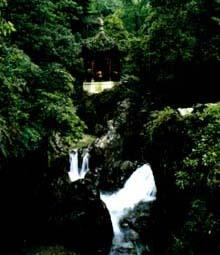 海拔710米距报国寺约15公里。自伏虎寺上行,经雷音寺、纯阳殿神水阁等古迹由神水阁再上行5公里即可到达。人称黑白二水洗牛心”。清音阁原叫牛心寺,后改名为卧云寺。清康熙初年重建。根据唐诗“春秋多佳日,山水有清音而更名为“清音阁”。 清音阁是峨眉山最迷人的去处之一。它背倚牛心岭面向五显岗白龙江和黑龙江交汇于阁下在黑白二水上各架有一座石拱桥,叫“双飞桥”。两桥之间,耸立一座‘双飞亭,又叫“接御亭”接王亭。相传,清康熙皇帝曾派头等侍卫海青伍格亲王到峨眉山各大寺庙赠送经卷、楹联,众僧特建此亭迎接,此亭因而得名。 从亭上往下看只见两江之水分道过两侨,奔腾而来,猛霹击水中一块形似牛心的巨石涛声灌耳,浪花飞贱,空气清凉宜人,这就是峨眉山著名“双桥清音”胜景。 清音阁下有两条急流奔出一水来自传说中的青蛇修炼的黑龙潭,叫黑水.一水来自白龙洞,叫白水。传说白龙洞是《白蛇传》中的白娘子修炼成仙的地方。