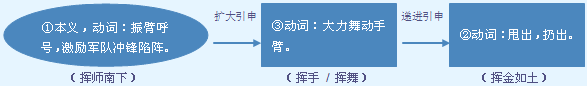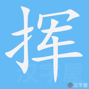 释义 | ![]() ❶挥舞。作带宾、带补谓语。 他不停地~着手中的小旗|局长的手无力地~了一下,示意我们出去|爷爷~起鞭子,吓唬着围在大车边上的孩子们|他大笔一~,把文章删去一半。 ❷用手把眼泪、汗珠儿等抹掉;散出。常用在固定词组中。 ~汗成雨|~金如土。 【词语】 挥斥 挥发 挥毫 挥霍 挥洒 挥师 挥手 挥舞 字源解说 军,既是形旁也是声旁,代表部队。挥,篆文 ![]() ![]() ![]() ![]() ![]() ![]() ![]() ![]() 附 文言版《説文解字》:揮,奮也。从手,軍聲。 附 白话版《说文解字》:挥,奋力摆手。字形采用“手”作边旁,采用“军”作声旁。 引申线索 ![]() 【字族索引】 军 【同音字】 huī |