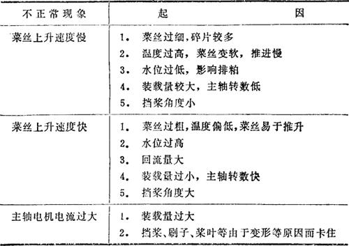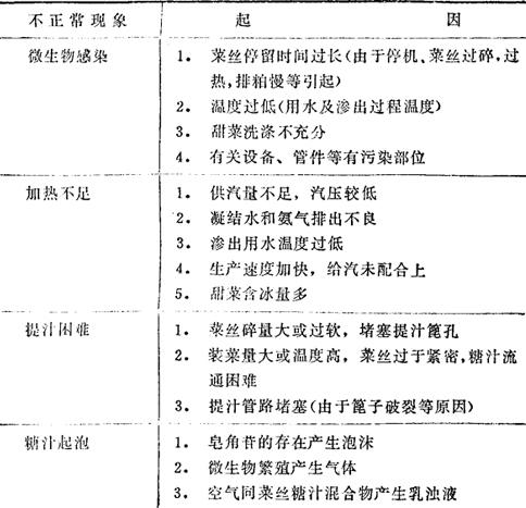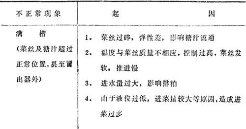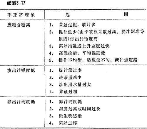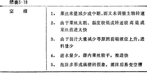 各种型式渗出器具有一些共性的不正常现象,但也有一些本型式特有的不正常现象。 表3-17为各种型式连续渗出器共有的一些主要不正常现象及其起因。 表3-17 各种渗出器的不正常现象   表3-18为双螺旋连续渗出器特有的一些不正常现象。 表3-18 双螺旋连续渗出器特有的不正常现象   注:1.为保证进料正常,进菜端应保持一束以上的菜柱 2.满槽应同由于泡沫过多而形成假象的满槽相区别,后者可采用加入消沫剂的方法处理 3.满槽时除根据起因采取相应措施外,应适当降低进菜量并稍降转速直至消除为止 表3-19为塔式连续渗出器特有的不正常现象。 表3-19 塔式连续渗出器特有的不正常现象  |