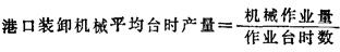 释义 | 港口装卸机械平均台时产量 每台装卸机械平均每作业一小时所完成的作业量。其计算公式为: 式中“机械作业量”是指每台装卸机械在作业过程中所起落或搬运的货物吨数的总和,其计量单位为起运吨;“作业台时数”是指装卸机械实际从事装卸作业的时间,亦即装卸机械开始装卸作业时起,至最后一次货物装卸完毕时止的全部时间,但需扣除在作业过程中半小时以上的停工或机械故障时间。因该部分时间应分别算为停工时间或非完好时间。港口装卸机械平均台时产量反映装卸机械装卸效率的高低。该指标的大小,与劳动组织、装卸人员的操作技术及装卸机械的性能有很大关系。 |