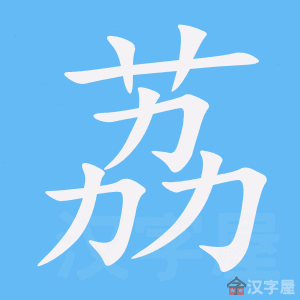 劦,既是声旁也是形旁,表示力大无比。荔,篆文=(艸,植物)+(劦,有力的),造字本义:一种类似草莓的多年生草本植物,叶片狭线形,花蓝色,其果子具有壮阳长力的食效。