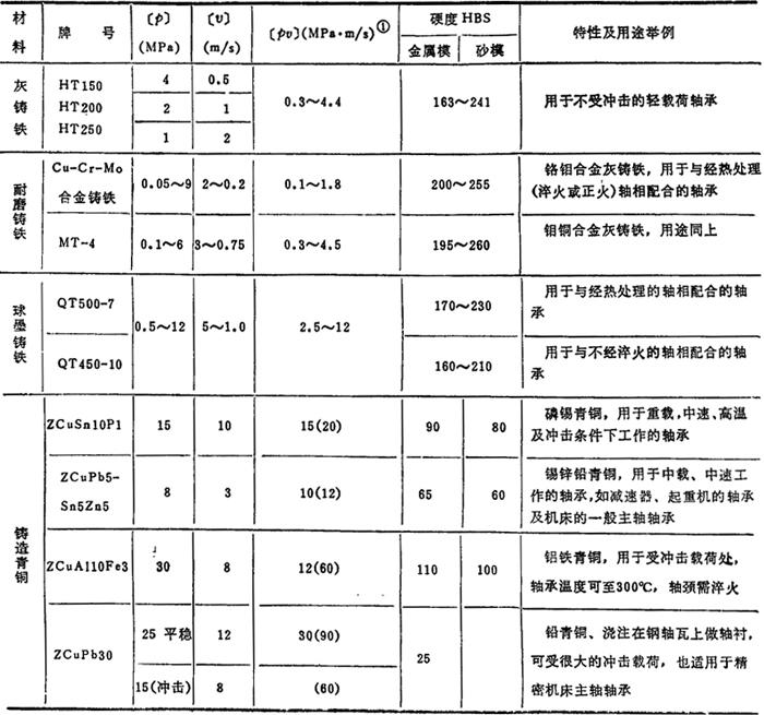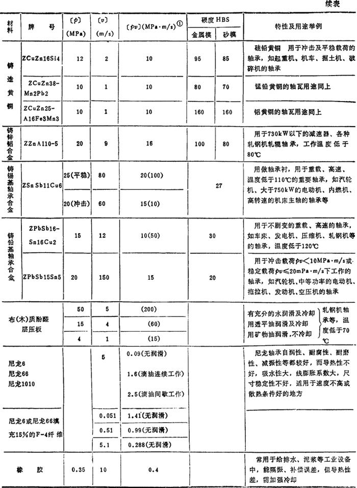 滑动轴承座的型号及承载性能见表4.9-2,其有关参数分别见表4.9-3~4.9-6;滑动轴承的轴瓦见表4.9-7~4.9-21;常用轴瓦材料见表4.9-22和4.9-23。 表4.9-2 滑动轴承座的型号说明及承载性能 表4.9-21 尼龙轴套的结构与尺寸 mm   注: ❶ 括号中的〔pv〕值为完全液体润滑时的许用值。 表4.9-23 粉末冶金(含油)轴承材料牌号及其物理机械性能(摘自GB2688—81)  注: ❶ 当v>1m/s时,〔p〕可按〔p〕=1.75/vMPa计算。 ❷ 材料牌号标记示例:铁基1类含油密度为5.7~6.2g/cm3的粉末冶金轴承材料,标记为。FZ1160 GB2688—81。 |