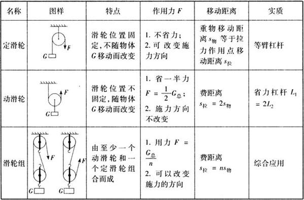 释义 | 滑轮可分为定滑轮、动滑轮和滑轮组 注意 表中F表示人对简单机械施加的作用力;G总表示被提物体及动滑轮的重力总和;S扛表示拉力F作用点移动的距离;s物表示物体G移动的距离;n表示吊著动滑轮和物体的绳子段数. |