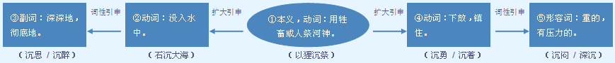 释义 | 沉 1 ★★★ 01003名![]() 分量大: 东西很~|~甸甸的箱子|那包有点儿~。 重 zhòng ★ “沉”多形容具体东西,“重”可用于比喻,形容抽象事物,如说“情深意重、心理负担过重”。 ❶ 没入水中: 破釜~舟|石~大海|小船慢慢地~到了河底。 浮 fú 漂~|水面上~着一层油污|下水后他一直~在水面上。 ❷ 分量重: 这袋东西相当~|~甸甸的果子挂在枝头上|他今天步子很~,大概有什么不开心的事情。 轻 qīng 病了很久,走路有点~飘飘|他~手~脚地出去了|这个包裹里没有装太多东西,所以很~。 ❸ 降落;下陷: 这楼的地基在下~|这几天没有风,所以灰尘都~在地面了。 升 shēng 热气球~空而去|初~的太阳如一个绚丽的火球般耀眼。 ❹ (程度)深: ~睡|~痛|~醉。 浅 qiǎn 交情还很~|~~一笑。 (在水里)往下落(跟“浮”相对);使降落,向下放(多指抽象事物)。能用在“把”字句里。常作带宾、带补谓语。 釜溪河今天~了一只船|我写了几封信给她,都石~大海|舱里没有进水,~不了|眼看要~下去了|船~得很快|他把东西~到海底了|~下了一只大船|我简直~不住气了|船很快就~了|小梁把脸一~,一句话也没有说。 ❶分量重;感觉沉重(不舒服)。作谓语,可带补语。 这口箱子很~|头很~|~得拿不动|胳膊~极了。 ❷程度深。可作谓语和补语。 午觉正~|睡得很~。 【近】 〈形〉重 【反】 〈动〉浮 〈形〉轻 【词语】 沉淀 沉浮 沉痼 沉积 沉积岩 沉浸 沉迷 沉湎 沉没 沉溺 沉稳 沉陷 沉香 沉箱 沉毅 沉吟 沉郁 沉冤 沉渣 沉滞 沉住气 沉醉 字源解说 沉,甲骨文 ![]() ![]() ![]() ![]() ![]() ![]() ![]() ![]() ![]() ![]() ![]() ![]() ![]() ![]() ![]() 引申线索 ![]() 【字族索引】 冗 【同音字】 chén |