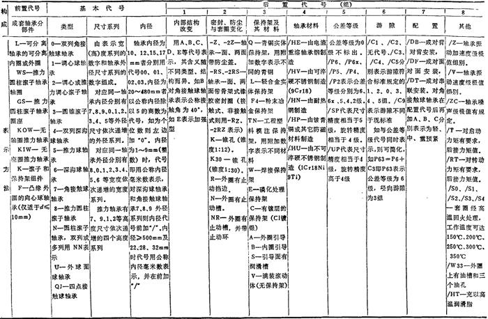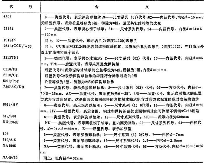 滚动轴承的代号是用一组字母和数字来表示其结构、尺寸、公差等级、技术性能等特征的产品符号。现行代号按GB/T272—93《滚动轴承代号方法》制订,与原代号(按GB272—88)有较大不同,作为过渡和便于对照,本手册所列的滚动轴承性能表中,将后者也列入。 滚动轴承代号由基本代号、前置代号和后置代号组成。基本代号表示轴承的基本类型、结构和尺寸,前置和后置代号是在轴承结构、尺寸、公差、材料、技术要求等有改变时,在其基本代号前后添加的补充代号。滚动轴承代号的排列和各位上数字和字母的含义如表4.10-2所示。 表4.10-2 滚动轴承的代号(摘自GB/T272-93)  滚动轴承代号举例如表4.10-3所示。 表4.10-3 滚动轴承代号示例  |