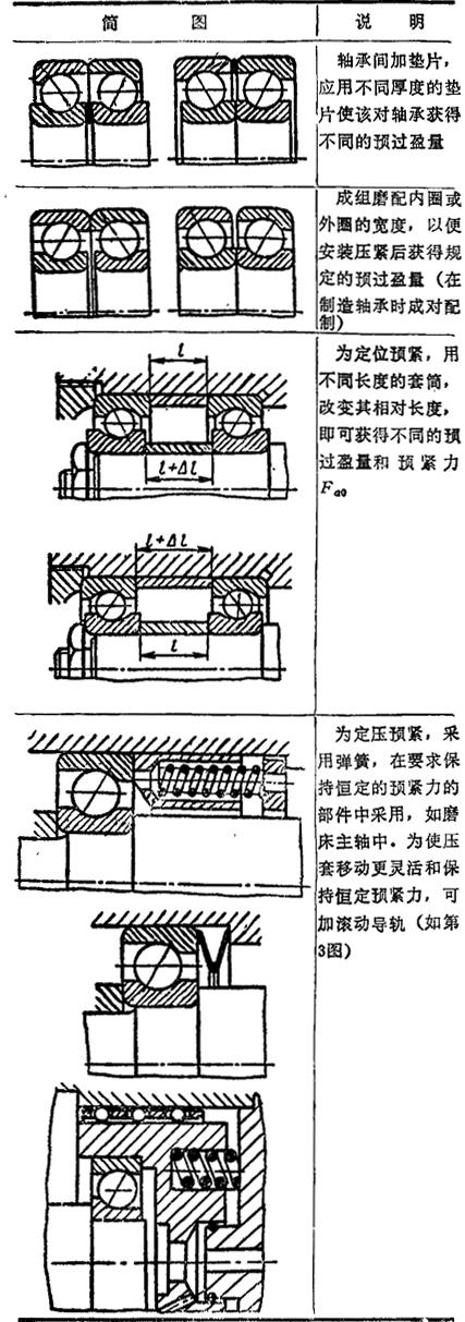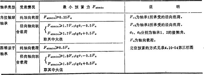 滚动轴承预紧的目的,多数是为增大其刚性,使旋转轴在轴向和径向正确定位,提高轴的旋转精度。但也有用以降低噪音和振动,如家用电器的小电机轴承的轻微预紧;在有外加热源的情况下,以防止运转时有过大的游隙;对高速轴承,用以防止滚动体产生公转或自转滑动;推力轴承在高速使用中,用以防止因离心力和陀螺效应使滚动体在套圈中滑动等。 预紧力按其的方向分,有轴向预紧和径向预紧;按施加预紧力的方法分则有定位预紧和定压预紧,前者指在使用过程中轴承的轴向位置保持不变,后者则是预紧力不变。通常情况,要求高刚度时,选用定位预紧;对高速运转的轴承,则采用定压预紧。实现预紧的典型方法见表4.10-54。 表4.10-54 滚动轴承实现预紧的方法  一般而言,在高速轻载条件下,或为提高旋转精度或为减小振动,可选用较小的预紧力;在中速中载或低速重载条件下,以及为了提高支承系统刚度,则可选用中预紧力或重预紧力。预紧力可计算求得〔44、53〕,但多数是应用试验或结合使用经验进行校正。定位预紧时,应使滚动体与滚道始终保持接触。此时,最小轴向预紧力可按表4.10-55的公式确定。 表4.10-55 定位预紧时的最小预紧力  |