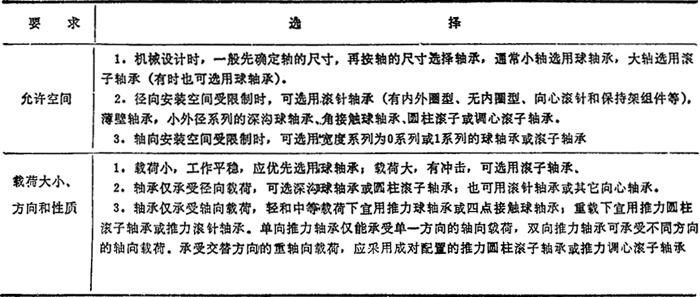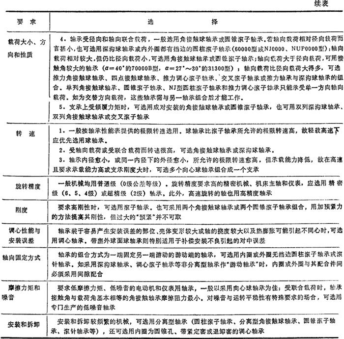 释义 | 滚动轴承类型的选择 滚动轴承类型的选择可根据机械运转条件对轴承的要求,参照表4.10-4综合考虑选定。 表4.10-4 机械的运转条件要求与滚动轴承类型的选择 在选择轴承类型时,还应考虑经济因素。同尺寸(内、外径)的轴承,以深沟球轴承价格最低,调心滚子轴承最高。从单位价格的承载能力看,则以圆锥滚子轴承为好。 |