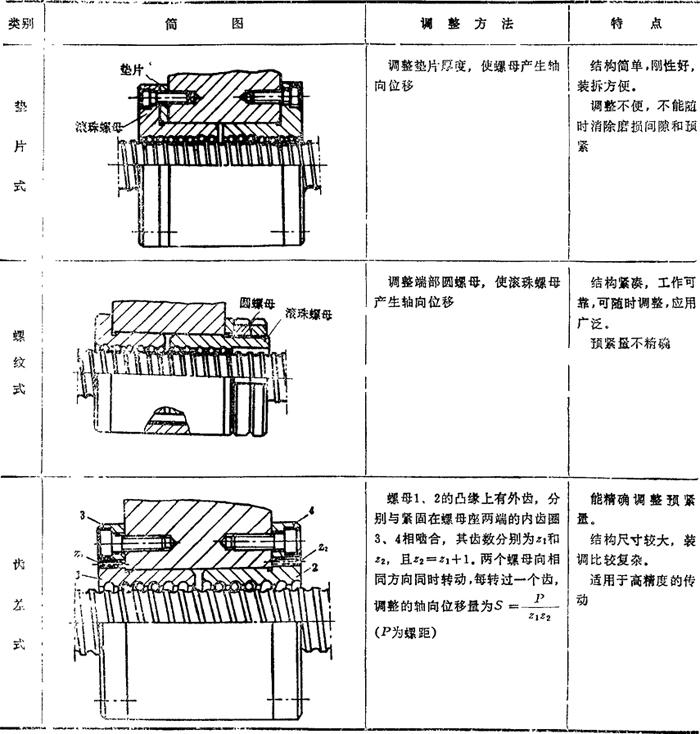 释义 | 滚珠丝杠副结构形式 按螺纹滚道法向截面形状、滚珠的循环方式、消除间隙和调整预紧方法的不同,滚动螺旋传动副有多种结构形式,见表4.18-18~4.18-20。 表4.18-18 螺纹滚道法向截面形状、参数关系和特点 |
