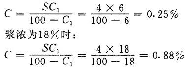 释义 | 漂白所需有效氯浓度的计算 【公式】 式中 C——有效氯浓度(%) S——漂自用氯量(漂率)(%) C1——漂白浆浓(%) 【例】 用氯量为4%,漂白浆浓由6%提高到18%,试求有效氯浓度的变化。 解:浆浓为6%时: 即有效氯浓度由0.25%提高到0.88%。 |