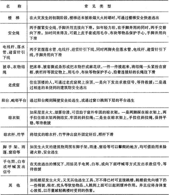 释义 | 火场逃生的原则和方法 (一)火场逃生的基本原则 1.加强个人防护,减少烟气侵害原则 人员一旦被烟火围困,无论是逃生,还是去灭火,最基本的要求就是要搞好自身防护。否则,由于火势猛,烟雾浓,温度高,人们将难以自保。因此,一旦觉察著火,当务之急应采取个人防护措施。例如利用毛巾、手帕、餐巾、沙发布、床单、衣服等用水浸湿(无水时用尿也可),扎住口鼻,防止吸入高温烟气。又如利用棉被、毛毯、地毯等用水浸湿,包裹好身体,就地滚出火焰区逃生。或滚向室内消火栓处,射水来灭火。其次,逃生过程中要爬行。当被烟火围困时,要沿承重墙朝出口爬行,即使站起来感觉烟火不大,身体承受得了,也应极力避免,千万不要站立行走。因为1.5m以上的空气里,早已含有大量一氧化碳。最后,逃离著火房间,千万要把门关牢,把火限制在起火房间内。 2.正确选择逃生捷径,减少被烟火围困时间 大火降临,人们容易在人群的簇拥下向著经常使用的楼梯奔去,即使那里已挤成一团,堵塞了出口,还是争相夺路不能离去。一方面是因为灾祸降临,人们挤在一团,以解除心理上的孤独和恐惧;一方面也是由于对所处环境不了解,对别处有无出口无把握。因此,选择逃生路线至关重要。 (1)选择最短的直通室外的通道、出口、消防电梯等。 (2)尽量避免对面人流和交叉人流。 (3)选择烟气尚未充斥有新鲜空气的防烟楼梯间,封闭楼梯间、通道、走道和出口。 (4)选择通向疏散楼梯间的通道出口。 (5)处在著火层的,应向下层逃生。 (6)处在著火层以上各层的,应向室外阳台、楼顶逃生。 (7)千万不要乘坐电梯。电梯井直通大楼各层,烟、热、火很容易涌入。在热的作用下会造成电梯失控或变形;烟的毒性、火的熏烤可危及人的生命,所以火灾时千万不要乘坐电梯。消防电梯仅供消防队使用,但也不是万无一失的,在美国曾发生过消防员乘坐电梯去22层火场,因电梯失控,结果所有在场的消防队员全部丧生的事故。 (二)火场逃生的常用方法 1.棉被护身法 用浸湿过的棉被(或毛毯、棉大衣)盖在身上,确定逃生路线后,用最快的速度直接钻进火场并冲到安全区域,但千万不可用塑料雨衣作为保护。 2.毛巾捂鼻法 火灾烟气具有温度高、毒性大的特点,人员吸入后很容易引起呼吸系统烫伤或中毒,因此在疏散中应用湿毛巾捂住口鼻,以起到降温及过滤的作用。 3.匍匐前进法 由于火灾发生时烟气大多聚集在上部空间,因此在逃生过程中应尽量将身体贴近地面匍匐(或弯腰)前进。 4.逆风疏散法 应根据火灾发生时的风向来确定疏散方向,迅速逃到火场上风处躲避火焰和烟气,同时也可获得更多的逃生时间。 5.绳索自救法 家中有绳索时,可直接将其一端拴在门、窗档或重物上,沿另一端爬下,在此过程中要注意手脚并用(脚成绞状夹紧绳,双手一上一下交替往下爬),并尽量采用手套、毛巾将手保护好,防止顺势滑下时脱手或将手磨破。 6.被单拧结法 把床单、被罩或窗帘等撕成条并拧成麻花状,如果长度不够可将数条床单等连接在一起,按绳索逃生的方式沿外墙爬下,但要切实将床单等扎紧扎实,避免其断裂或结头脱落。 6.管线下滑法 当建筑外墙或阳台边上有落水管、电线杆、避雷针引线等竖直管线时,可借助其下滑至地面,同时应注意一次下滑的人数不宜过多,以防逃生途中因管线损坏而致人坠落。 8.竹竿插地法 将结实的竹竿、晾衣杆直接从阳台或窗口斜插到室外地面或下一层平台,两头固定好以后顺杆滑下。 9.楼梯转移法 当火势自下而上迅速蔓延而将楼梯封死时,住在上部楼层的居民可通过老虎窗、天窗等迅速爬到屋顶,转移到另一人家或另一单元的楼梯进行疏散。 10.攀爬避火法 通过攀爬至阳台、窗台的外沿及建筑周围的脚手架、雨篷等突出物以躲避火势。 11.搭“桥”过渡法 可在阳台、窗台、屋顶平台处用木板、竹竿等较坚固的物体搭至相邻单元或相邻建筑,以此作为跳板转移到相对安全的区域。 12.毛毯隔火法 将毛毯等织物钉或夹 在门上,并不断往上浇水 冷却,以防止外部火焰及 烟气侵入,从而达到抑制 火势蔓延速度、延长逃生 时间的目的。 13.卫生间避难法 当实在无路可逃时,可利用卫生间进行避难。用毛巾塞紧门缝,把水泼在地上降温,也可躺在放满水的浴缸里躲避。但千万不可钻到床底、阁楼、大橱等处避难,因为这些地方可燃物多或容易聚集烟气。 14.火场求救法 发生火灾时,可在窗口、阳台或屋顶处向外大声呼叫、敲击金属物品或投掷软质物品,如白天可挥动鲜艳布条发出求救信号,晚上可挥动手电筒或白布引起救援人员的注意。 15.跳楼求生法 火场上切勿轻易跳楼!在万不得已的情况下,住在低楼层的居民可采取跳楼的方法进行逃生,但首先要根据周围地形选择落差较小的地块作为著地点,然后将席梦思床垫、沙发垫、厚棉被等抛下作缓冲物,并使身体重心尽量放低,做好准备以后再跳。 16.平时应留意的几个问题 (1)安装防盗门窗时,千万不要把自己的逃生之路封死。防盗窗应有活络档,防盗门应由内向外开启,应采用插入式。避免火灾断电失去照明时因找不到钥匙,或钥匙插不进锁心,而贻误逃生时间的情况发生。 (2)走进商场、电影院、卡拉OK舞厅等公共场所时,请别忘了观察安全出口和疏散通道的位置,多长一个心眼,就多了一线生机。 (3)家居生活、差住旅馆,要熟悉一下周围环境,记
