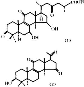 【概况】: 异名 三秀(《楚辞》),芝(《尔雅》)。 基源 为多孔菌科灵芝属真菌的灵芝及紫芝的子实体 原植物 作灵芝草药用的通常有2种:灵芝Ganoderma lucidum(Leyss.ex Fr.)Karst.,又名赤芝(江苏)。紫芝Ganoderma japonicum(Fr.)Lloyd,又名木芝《本经》。 历史 灵芝作药用,早见于《本经》,列上品,分为六种。 《纲目》载:“芝本作之,篆文象草生地上之形,后人借之字为语辞,遂加草以别之也。尔雅云:菌,芝也。注云:一岁三华瑞草。 或曰生于刚处曰菌,生于柔处曰芝。……芝亦菌属可食者。 ”目前民间所收集的几个药用灵芝标本,经鉴定,主要系灵芝,紫芝以及薄盖灵芝,Ganoderma capense(Lloyd)Teng。灵芝,长期被视为吉祥草。 《前汉书》汉宣帝时已作为瑞祥之草,继后历代则附加以传奇或宗教色彩,如《太上灵宝芝草品》全卷记有芝类127种,并备有示意图,经《新华本草纲要》考之多为本品或代用品。 形态 菌盖木栓质,肾脏形,或半圆形,罕近圆形,红褐色、红紫或暗紫色,具有一层漆状光泽,有环状棱纹及辐射状皱纹,大小及形状变化很大,大型个体的菌盖为20×10cm,厚约2cm,一般个体为4×3cm,厚0.5~1cm,下面有无数小孔,管口呈白色或淡褐色,每1mm内有.4~5个,管孔圆形,内壁为子实层,孢子产生于担子顶端;菌柄侧生,极稀偏生,长度通常长于菌盖的长径,紫褐色至黑色,有一层漆状光泽,中空或填塞的,坚硬。 孢子呈卵圆形,8~11×5~7μm.壁有二层,内壁褐色,表面有无数小 ,中央有一个油滴,外壁透明无色。(图见《中国药用真菌》.98页.图35) 生境与分布 多生长在阔叶树的木桩旁地上或朽木上,有时也生长在针叶树种上;现已有很多地区人工培养。 中国各地均有分布。 为北半球温带广布种。 紫芝与灵芝主要区别在于 菌盖和菌柄皮壳均呈黑色,具漆光泽,菌肉和菌管均为锈褐色。(《图见《中国的真菌》.94页.图34)多生于阔叶树的木桩旁地上或朽木上,或生长在针叶树朽木上。分布于长江以南各地。。【生药】: 采集 秋季采收,晒干。 【化学】: 紫芝含麦角甾醇(Ergostero1)[1,2]、顺蓖麻酸、延胡索酸、氨基葡萄糖、多糖类、树脂、甘露醇[1]、硬脂酸、苯甲酸、γ-氨基酸、甘氨酸、丙氨酸等[2]。 灵芝含麦角甾醇、树脂、脂肪酸、甘露醇、多糖[3],生物碱、内酯、香豆精、水溶性蛋白质[4],无机离子( ,K+)、香豆素甙、挥发油、维生素B2、维生素C[5],r-氨基酸、甘氨酸、丙氨酸[2]、胱氨酸、酪氨酸、亮氨酸、谷氨酸、γ-氨基丁酸[6],十九烷酸、二十二烷酸、二十四烷酸、棕榈酸、二十四烷、三十一烷[8,9]、硬脂酸、苯甲酸[2]、胆碱、甜菜碱、β-谷甾醇[8,9]、β-(1→6)(1→3)葡聚糖[6]、β-(1→6)(1→3)甙键阿拉伯半乳聚糖[7]、由葡萄糖和阿拉伯糖组成的肽多糖(葡萄糖:阿拉伯糖=4∶1)[6]、灵芝酸A(Ganoderic acid A)(1)[10~12]、灵芝酸B[10,11,13]、灵芝酸C[12~14]、灵芝酸甲酯D(Methyl ganoderate D)[12,15]、灵芝酸甲酯E(Methyl ganoderate E)[15~17]、灵芝酸甲酯F(Methyl ganoderate F)[15,16]、灵芝酸甲酯G(Methyl ganoderate G)[16,18]、灵芝酸甲酯H(Methyl ganoderate H)[15]、灵芝酸甲酯I(Methyl ganoderate I)[18]、灵芝酸甲酯J(Methyl ganoderate J)[19,20]、灵芝酸K(Ganoderic acid K)[21]、灵芝酸甲酯L(Methyl ganoderate L)[22]、灵芝酸甲酯M(Methyl ganoderate M)、灵芝酸甲酯N(Methyl ganoderate N)、灵芝酸甲酯O(Methyl ganoderate O)[23]、灵芝酸甲酯K2(Methyl ganoderate K2)、化合物B8(C31H48O7)、化合物B9(C31H50O7)[20]、灵芝酸C2(Ganoderic acid C2)[12,20,24]、灵芝烯酸A(Ganoderenic acid A)、灵芝烯酸B(Ganoderenic acid B)、灵芝烯酸C(Ganoderenic acid C)、灵芝烯酸D(Ganoderenic acid D)[16]、赤灵芝酸甲酯A(Methyl ganolucidate A)、赤灵芝酸甲酯B(Methyl ganolucidate B)[18,25]、赤灵芝酸甲酯C(Methyl ganolucidate C)[19]、赤灵芝酸甲酯D(Methylganolucidate D)[22]、灵芝酸Ma(Ganoderic acid Ma)、灵芝酸Mb(Ganoderic acid Mb)、灵芝酸Mc(Ganoderic acid Mc)、灵芝酸Md(Ganoderic acid Md)[26]、灵芝酸Mg(Ganoderic acid Mg)、灵芝酸Mh(Ganoderic acid Mh)、灵芝酸M(Ganoderic acid M1)、灵芝酸M1(Ganoderic acid M1)[27]、灵芝酸U(Ganoderic U)、灵芝酸V(Ganoderic acid V)[28]、灵芝酸W(Ganoderic acidW)[26,28]、灵芝酸Z(Ganoderic acid W)[28]、灵芝醇G(Ganoderiol G)、灵芝醇H(Ganoderiol H)、灵芝醇I(Ganoderiol I)、双乙酰灵芝醇C(Diacetate ganoderiol C)、双乙酰灵芝醇D(Diacetate ganoderiol D)、双乙酰灵芝醇E(Diacetate ganoderiol E)、赤灵芝酸E(Ganolucidic acid E)[29]、3β,15α-Diacetoxylanosta-8,24-dien-26-oic acid[30]、灵芝醛B(Ganoderal B)[31]、环氧灵芝醇A(Epoxyganoderiol A)[31,32]、灵芝酸Me(Ganoderic acid Me)、灵芝酸Mf(Ganoderic acid Mf)[26]、灵芝酸P(Ganoderic acid P)[33]、灵芝酸Q(Ganoderic acid Q)[2733]、灵芝酸R(Ganoderic acid R)[26,34]、灵芝酸S1(Ganoderic acid S1)[21]、灵芝酸S2(Ganoderic acid S2)[34]、灵芝酸T(Ganoderic acid T)[26,34]、灵芝酸X(Ganoderic acid X)、灵芝酸Y(Ganoderic acid Y)[28]、灵芝醇F(Ganoderiol F)[20]、灵芝单醇A(Ganoderol A)、灵芝单醇B(Ganoderol B)[21,1]、灵芝醇B(Ganoderiol B)[35]、Ganodermatriol、灵芝醇A(Ganoderiol A)、Ganodermanontriol[36]、Ganodermanondiol[37]、灵芝醛A(Ganoderal A)[21],环氧灵芝醇B(Epoxyganoderiol B)、环氧灵芝醇C(Epoxyganoderiol C)[29,31]、3α,5α,22α-三羟基羊毛甾-7,9(11),24-三烯-26-酸(3α,5α,22α-Trihydroxylanosta-7,9(11),24-trien-26-oic acid)、3β,15α,22α-三羟基-7,9(11),24-三烯-26-酸(3β,15α,22α-Trihydroxylanosta-7,9(11),24-trien-26-oic acid)、3α,15α-二乙酰氧-22α-羟基羊毛甾-7,9(11),24-三烯-26-酸(3α,15α-Diacetoxy-22α-hydroxylanosta-7,9(11),24-trien-26-oic acid)、3β,15α