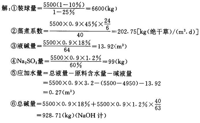释义 | 烧碱与亚硫酸钠作蒸煮剂用碱量的计算 【例】某厂用40m3蒸球蒸煮稻草,装球量为5500kg(风干),烧碱用量为18%(NaOH),Na2SO3用量为1.2%,液比1∶3.2,蒸煮作业全程时间为6h,粗浆得率为45%,原料水分为25%,求: |