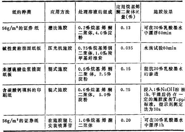 关于烷基烯酮二聚体(AKD)的结构、性质和应用详见内部施胶一节中。它可应用在内部施胶,也可应用于表面施胶。 在应用于表面施胶以前,应先将烷基烯酮二聚体乳液分散于温水(54~65℃)中,通常使用的浓度是0.1~2.0%,低浓度的胶料也有效。欲施胶的纸页不应含有松香胶和硫酸铝。 烷基烯酮二聚体可单独使用,也可分散于一些表面施胶剂溶液如淀粉、羧甲基纤维素中与之混合使用。这种表面施胶剂溶液应尽可能保持冷却,并使之不过于呈碱性,加入烷基烯酮二聚体后应立即使用,以避免胶料的迅速水解。烷基烯酮二聚体的水解速率决定于温度和pH值。 烷基烯酮二聚体作为表面施胶剂可用各种表面施胶的方法进行施胶,通常在用于薄纸或中等厚度的纸张时,用辊式表面施胶或槽法表面施胶,在用于厚纸或纸板时,则可用压光机表面施胶,使用喷雾法表面施胶也是有效的。 在没有松香胶和硫酸铝的存在下,烷基烯酮二聚体在表面施胶中的应用如表10—3—57所示。 表10—3—57  |