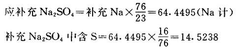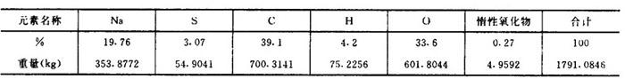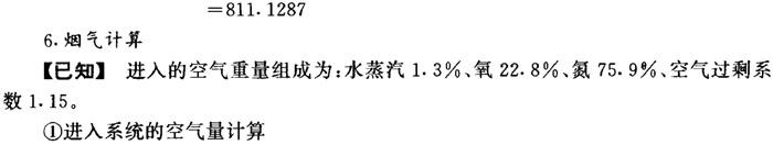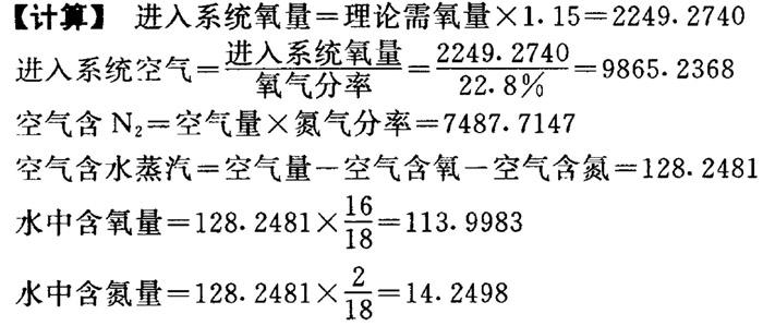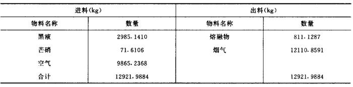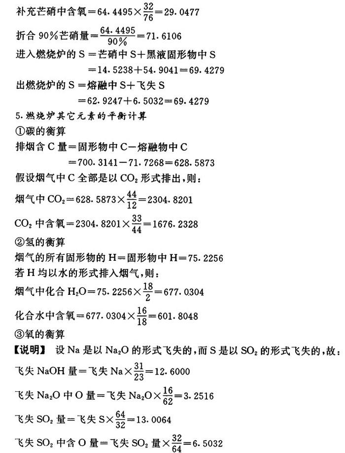 释义 | 燃烧段的计算 4.Na和S元素的平衡及芒硝补充量计算 理论耗氧量=熔融物中氧+飞失Na2O含氧+CO2含氧+SO2中含氧 +化合水中氧—固形物中氧—芒硝含氧 =298.9501+3.2516+1676.2328+6.5032 +601.8048-601.8044-29.0477 =1955.8904 ❹ 惰性氧化物的处理计算 【说明】 固形物中惰性氧化物的量为4.9592kg。芒硝带入杂质量为7.161kg,共12.1203kg。设这些物质在燃烧时不起反应,直接进入熔融物中,然后在苛化中作为绿泥除去。 【计算】 熔融物量=Na2S+Na2SO4+Na2CO3+惰性氧化钠+芒硝杂质 ❷ 烟气组成计算 【计算】 烟气中的水=化合水+黑液中水+空气中水 =677.0304+1194.0564+128.2481 =1999.3349 烟气水中氧=1277.1866 烟气水中氢=222.1483 烟气中的SO2=13.0064 烟气SO2中硫含量=6.5032 烟气SO2中氧含量=6.5032 烟气中的CO2=2304.8201 烟气CO2中氧=1676.2328 烟气CO2中碳=628.5873 烟气中的Na2O=12.6000 烟气Na2O中氧=3.2516 烟气Na2O中钠=9.3484 烟气中的N2=7487.7147 烟气中的O2=293.3836 烟气总量=烟气中水+SO2+CO2+Na2O+N2+O2=12110.8597 7.燃烧炉中总物料平衡 【说明】 燃烧炉总物料平衡情况列于表1-18-4。 表1-18-4 燃烧炉总物料平衡 |