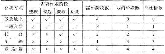 亦称“物资的搬运活性”。 物资的装载和存放状态被移动的难易程度。一般可将物资的装载存放状态分为五种情况,即就地散放、装入箱内、码放在托盘上、放置在搬运车上和置于移动中的输送机上。处于不同状态的物资被移动时的难易程度不同,所需要的作业阶段也不同,如下表所列。  若将散放在地面上的物资运走,需要整理、架起、提取和运走等四个作业阶段;若将物资装入箱内,运走时需要架起、提取、运走等三个作业阶段;若物资码放在托盘上,运走时需要提取、运走两个作业阶段;若物资放置在搬运车上,运走时只需要一个作业阶段;若将物资直接放到运行中的输送带上,则不需任何作业阶段。将以上五种状态下物资移动的难易程度用活性指数0-4表示。从理论上讲活性指数愈高愈好,但还要考虑到实施的可能性。 如活性指数为4的输送带和活性指数为3的搬运车,不适合大批量物资的存放,所以一般很少采用。在物资仓库采用活性指数为2的托盘码放是最合理的。 |