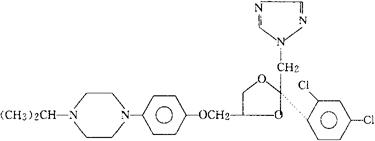 C26H31Cl2N5O3=532.47 CAS-67915-31-5 顺-1-[4-[[2-(2,4-二氯苯基)-2-(1H-1,2,4-三唑-1-基甲基)-1,3-二氧戊环-4-基]甲氧]苯基]-4-(1-甲基乙基)-哌嗪。 Piperazine,1-[4-[[2-(2,4-dichlorophenyl)-2-(1H-1,2,4-triazol-1-ylmethyl)-1,3-dioxolan-4-yl]methoxy]-phenyl]-4-(1-methylethyl)-,cis-. 顺-1-[对-[[2-(2,4-二氯苯基)-2-(1H-1,2,4-三唑-1-基甲基)-1,3-二氧戊环-4-基]甲氧]苯基]-4-异丙基哌嗪。 cis-1-[p-[[2-(2,4-Dichlorophenyl)-2-(1H-1,2,4-triazol-1-ylmethyl)-1,3-dioxolan-4-yl]methoxy]phenyl]-4-isopropylpiperazine. 抗真菌药。 Terconazole,Terazol Cream & Suppositories,R-42,470 Triaconazole,Fungistat,Gyno-Terazol,Tercospor. INN,BAN,DCF,DCIT,USAN.