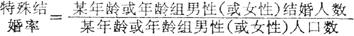 释义 | 特殊结婚率 指按生育年龄分组计算的男性结婚率及女性结婚率。 用千分数表示。计算公式为: 特殊结婚率对于深入分析人口再生产情况具有重要作用:女性的特殊结婚率可以与特殊生育率比较,观察两者的相互关系;可以从法定结婚年龄的男性或女性的结婚率,了解男女婚姻的动态与静态变化;可以分析不同年龄的结婚率状况及同年龄在不同时期的结婚率变化。 |