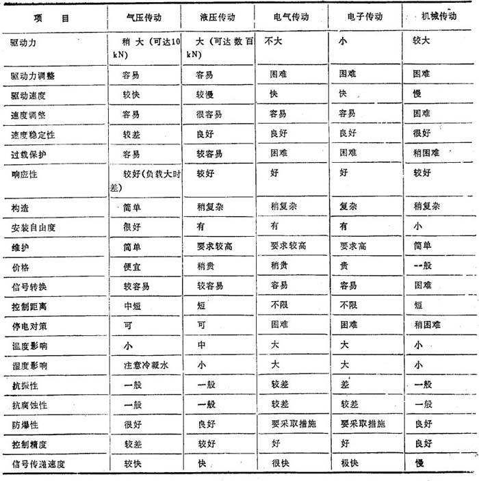 以压缩气体(通常为空气)为工作介质,实现动力传递和工程控制的系统,称为气压传动和控制系统,简称气动。气动与其它传动方式的比较见表7.10-1。可见,气动的特点有: 表7.10-1 气动与其它传动方式的比较  ❶ 元件结构简单、紧凑,易于制造。作为工作介质的空气,使用后可直接排放,不污染环境。此外,由于空气在管道内的流动损失小,故可集中供气和远距离输送,便于管理。 ❷ 易于实现快速的直线往复运动、摆动和高速转动。输出力和运动速度的调节都很方便,且能实现过载自动保护。 ❸ 工作环境的适应性较强,能在易燃、易爆、粉尘多、强磁、潮湿、温度变化大以及存在腐蚀性气体等恶劣条件下,安全可靠地工作。 ❹ 由于压缩空气的工作压力不高,一般在0.4~0.6MPa,故输出力和力矩不高,且传动效率也较低,一般用于输出力不大的传动装置。采用机械扩力机构或气液增压装置,可提高输出力。 ❺ 由于空气有压缩性,故运动速度的稳定性较差,较难实现精密控制。采用气液联动方式,可提高运动速度的稳定性。 ❻ 由于气信号的传递速度比电信号慢得多,故不宜用于遥控及复杂的控制系统。 |