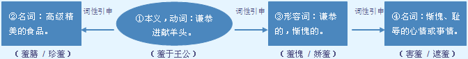释义 | 羞 1 ★★★ 02110名![]() 怕别人笑话的心理和表情;难为情;不好意思。 a.作带补谓语。 她~得满脸通红|他像小姑娘似的~得低下了头|看见熟人过来,她~得忙背过身|一个女孩子做这样的事,你不~我还~哩。 b.作“感到”“觉得”等动词的宾语。 面对这么多陌生人,她感到有些~|在庄重的场合讲话,她总觉得~。 使难为情;不好意思。作带宾、带补谓语。 小妹划着脸~哥哥|他最会~人了|事已至此,你就别~我了|~红了脸|~死人了。 耻辱。作宾语。 这个人从来不知~|做错了事,不要忙着去遮~,而要勇敢地承认、改正。 【词语】 羞答答 羞羞答答 羞愤 羞赧 羞怯 羞辱 羞涩 羞恶 羞与为伍 字源解说 羞,甲骨文 ![]() ![]() ![]() ![]() ![]() ![]() ![]() ![]() ![]() ![]() ![]() ![]() 附 文言版《説文解字》:羞,進獻也。从羊,羊,所進也;从丑,丑亦聲。 附 白话版《说文解字》:羞,进献。字形采用“羊”作边旁,羊,所进献的贡品;字形也用“丑”作边旁,“丑”同时也是声旁。 引申线索 ![]() 【字族索引】 羞 丑 【同音字】 xiū |