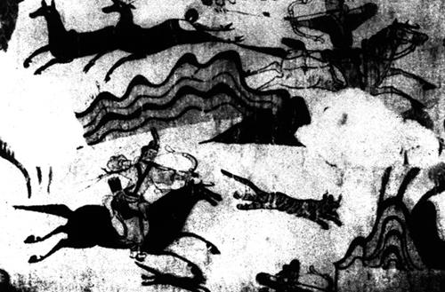 【作品赏析】: 在舞踊冢中居正壁右侧,与舞踊图相对的一面,除和正壁相连处画二牛车外,以一株大树相间隔主要画了大型狩猎图。 高句丽人豪爽慓悍,因地处山区,狩猎是国中男子从事的主要生产和社会活动,以至有每年“春秋校猎,王亲临之”的全国校猎。因而高句丽壁画中经常绘制狩猎图绝非偶然,而是忠实地反映了现实的社会生活。画中表现数名猎手骑马奔突于山岳之间追猎鹿、虎。据记载,当时的民族服装是“人皆皮冠,使人加插鸟羽”,画中射猎者的服饰正体现了当时的习俗。画家在表现时以勾线为主,山岳的形式则以稚拙的图案化体现,只作为环境的示意来处理,而突出表现勇武的骑士和猎物之间的紧张追逐。画面的猎手均向一个方面飞驰,强调了追猎方向的一致性,但被猎的动物却左右奔突,使张弓怒射的猎手身姿一正一反,加强了画面的变化,马色黑白相间进而使色彩变化更为丰富。 狩猎图是高句丽的优秀绘画作品,通过这类绘画可以看出与中原画风的联系。 高句丽壁画中经常表现的飞仙形象,以及公元372年佛教传入后佛教绘画内容的出现,在画史研究中均有重要意义。 。  五世纪 壁画 吉林集安高句丽墓 |