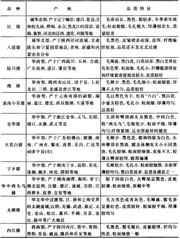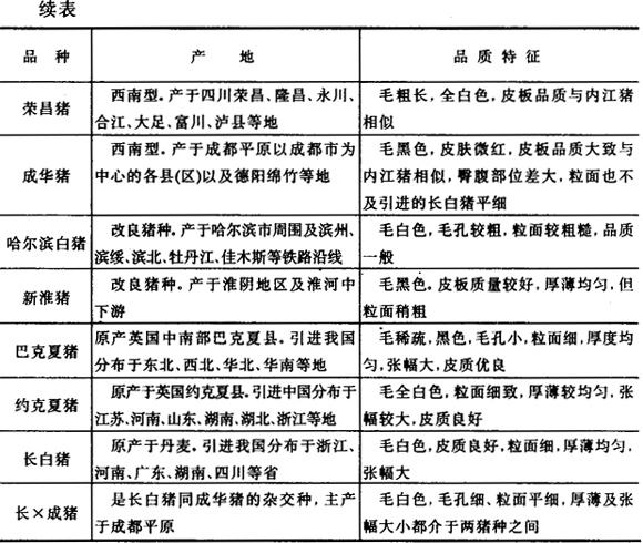 释义 | 猪皮 1996年,世界猪的存栏数为9.24亿头,我国约4亿头,约占43%。猪皮是我国制革工业的主要原料皮。1996年达到9000万自然张,折合牛皮计占我国制革原皮的50%以上。 (一)猪的品种及其分布 我国的猪遍布全国各地,种类有华北型、华南型、华中型、华北华中过渡型,西南型和高原型等48种,称为地方品种。另有培育猪种12个,引进猪种6个;此外,还有以长×成为代表的杂交猪种。地方猪种和培育猪种的分布见图1-30。引进猪种几乎遍布全国各地。长×成猪种主要在川西平原以成都附近的区县居多。 〇地方品种:1-民猪 2-八眉猪 3-黄淮海黑猪 4-汉江黑猪 5-太湖猪 6-姜曲海猪 7-东串猪 8-虹桥猪 9-蒲田猪 10-圩猪 11-阳新猪 12-台湾猪 13-宁乡猪 14-华中两头乌猪 15-湘西黑猪 16-大围子猪 17-大花白猪 18-金华猪 19-龙游乌猪 20-闽北花猪 21-嵊县花猪 22-乐平猪 23-杭猪 24-赣中南花猪 25-玉江猪 26-武夷黑猪 27-清平猪 28-南阳黑猪 29-皖浙花猪 30-内江猪 31-荣昌猪 32-成华猪 33-雅南猪 34-湖川山地猪 35-乌金猪 36-关岭猪 37-藏猪 38-两广小花猪 39-粤东黑猪 40-海南猪 41-滇南小耳猪 42-蓝塘猪 43-香猪 44-隆林猪 45-槐猪 46-五指山猪 47-沂蒙黑猪 48-福州黑猪 △培育品种:1-哈尔滨白猪 2-新金猪 3-东北花猪 4-新淮猪 5-上海白猪 6-北京黑猪 7-伊犁白猪 8-赣州白猪 9-汉中白猪 10-泛农花猪 11-山西黑猪 12-三江白猪 (二)猪皮的主要品种、产地、品质特征 表1-45 猪皮的主要品种、产地、品质特征 (三)猪皮生产季节对品质的影响 生产季节对猪皮品质的影响没有其它皮大,但也可分冬皮、春皮、夏皮和秋皮。 (1)冬皮:霜降至雨水期间的皮称“冬皮”,其品质最好,张幅和质量也最大。 (2)春皮:雨水至立夏期间的皮称“春皮”,其品质较冬皮差,也较冬皮轻。 (3)夏皮:立夏至白露期间的皮称“夏皮”,这期间的皮,一般毛稀疏,板质薄,品质更差,质量和面积也小。 (4)秋皮:白露至霜降的皮称“秋皮”,这期间的皮品质较好,质量和面积都增大,毛短而尖挺,有光泽。 (四)猪皮的品质鉴定 猪皮基本上都是盐湿皮。鉴定猪皮首先看猪种和产地,其次看伤残。猪的性别对皮影响虽大,但因猪以供食用为主,母猪和种猪宰剥比例小,不难辨认。 1.品种和产地 猪的品种和产地不同,其品质差别很大。一般而言,大型猪皮厚,张幅大,但皱纹深而多,毛孔大,粒面粗;小型猪皮板薄,张幅较小(在1m2以下),皱纹浅少,粒面细致;中型猪则介于两者之间。杂交改良猪的皮板较薄,张幅适中,在1~1.2m2左右,皱纹浅少,粒面细致;引进猪皮张幅大,厚薄均匀,粒面细。 2.伤残 猪皮的伤残分自然伤残和人为伤残两大类。自然伤残主要有咬伤、癣癞、击伤、疮疤、划刺伤、擦伤和肥皱等。人为伤残有描刀、刀洞、削油伤、皮形不全等。 3.质量和面积 猪皮的质量和面积需综合考虑,主要是考虑其带油率。 (五)猪皮的分级 宰剥适当,皮形完整的猪皮分级标准如下: 1.鲜猪皮 甲级皮:净皮重(除去油脂)在3kg以上(包括3kg),主要部位可允许有下列伤残之一: (1)描刀 不超过三处,总长度不超过24cm,深度不及皮厚的1/3。 (2)削薄 不超过三处,总面积不超过20cm2,深度不及皮厚的1/2。 (3)咬伤 不超过三处,总面积不超过20cm2。 (4)如(1)、(2)、(3)项交叉兼有时,总处数不得超过三处,总面积不得超过27cm2。 乙级皮:净皮重(除去油脂)在3kg以上(包括3kg),主要部位之各种伤残不得超过下列的规定之任何一项。 (1)破洞 不超过三处,总面积不得超过27cm2。 (2)描刀 不超过六处,总长度不超过40cm,深度不及皮厚的1/3。 (3)削薄 不超过六处,总面积不超过60cm2,深度不及皮厚的1/3。 (4)痘疤、癣癞、咬伤、钩伤、打伤等总和不超过三处,总面积不超过27cm2。 (5)如(1)、(2)、(3)、(4)项交叉兼有时总数不得超过六处,总面积不得超过60cm2。 丙级皮:净皮重(除去油脂)不得低于3kg(包括3kg),全皮尚有75%以上制革利用价值者。但一处破洞面积不得超过155cm2,超过者则不符合丙级皮标准。 等外皮:净皮重(除去油脂)在2kg以下(包括2kg),整张皮尚有50%以上制革利用价值者。 胶料皮:整张皮制革利用价值不足50%者及不足2kg(除去油脂)的猪娃皮。 2.盐湿猪皮 盐腌鲜猪皮的等级规格,应符合以上鲜猪皮的等级标准;要求用盐腌透,不得有腐烂变质。 甲级皮:不得有透油和掉毛现象(掉毛以用手能轻轻拔掉为准;主要部位不允许发黑、发紫;红斑不得超过60cm2。 乙级皮:不得有腐烂穿洞(以用手能顶破或拉破为准)和皮面发黑、发紫的现象。主要部位透油和掉毛现象及肉面红斑总面积不得超过100cm2。 丙级皮、等外皮、胶料皮均按以上鲜猪皮相同各项所规定的制革利用价值的百分比进行核定。 在实际生产过程中,以双机皮(机器剥皮,机器去肉)的皮质为最好,并多以质量为标准进行组批投产,5kg以上的被分成大皮(厚型皮),4~5kg的皮被分成中皮(中型皮),而4~3kg的皮归成小皮(薄型皮)。 |