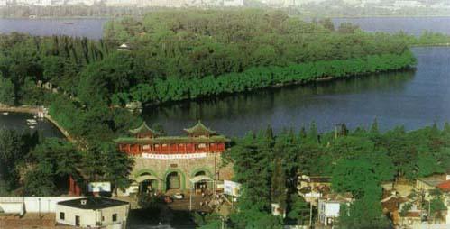 位于南京城东偏北,紧邻市中心区。在玄武门外、鸡鸣寺北。古名桑泊,又称作后湖、练湖、北湖、饮马塘、秣陵湖、蒋陵湖、习武湖等。相传刘宋文帝时,因见湖中出现黑龙,故改称玄武湖。曾是历代帝王游猎吟咏和训练水军的场所。全园面积472公顷,其中陆地104公顷,水面368公顷。玄武湖被称为“金陵第一大湖”。 玄武湖中有五洲,即环洲、樱洲、梁洲、翠洲、菱洲。环洲位于湖西南,因湖形屈曲似环、抱樱洲于内而得名。洲上遍植垂柳,微风拂来,宛如烟云缭绕,故有“环洲烟柳”之称。从环洲向东,经过小桥抵樱洲,因洲上植樱桃而得名,有“樱洲花海”之誉。从环洲越芒桥是梁洲,洲上树木繁茂,名胜古迹众多。从梁洲过翠桥至翠洲,这里绿草如茵,佳木繁多,构成了“翠洲云树”的清雅特色。菱洲位于玄武湖的中心,有“菱洲山岚”之美誉。翠洲有露天剧场、万人游泳池。菱洲因古时盛产红菱而得名,洲上有动物园和明洪武年间所筑武庙祠,宣统元年(1909)辟为公园。今称玄武湖公园,玄武湖与四周的覆舟山和山上的九华塔、紫金山、鸡鸣古寺和古城断垣借景,尤显湖光山色如画。