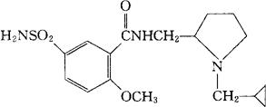 C17H25N3O4S=367.46 CAS-68475-40-1 N-[[1-(环丙甲基)-2-吡咯烷基]甲基]-5-氨磺酰-邻-茴香酰胺。 N-[[1-(Cyclopropylmethyl)-2-pyrrolidinyl]methyl]-5-sulfamoyl-o-anisamide (±)-5-(氨磺酰基)-N-[[1-(环丙甲基)-2-吡咯烷基]甲基]-2-甲氧苯甲酰胺 (±)-5-(Aminosuzonyl)-N-[[1-(cyclopropylmethyl)-2-pyrrolidinyl]methy]-2-methoxybenzamide. 镇吐药。 Cipropride,SL-74036. INN,USAN.  |