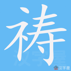 祷,篆文=(示,祝告)+(寿,长命),造字本义:祝告神灵,祈求平安长寿。篆文异体字加“老” 、加“口”,将 写成。隶书将篆文异体字的“老” 简化成“士”。俗体楷书将正体楷书简化成 是“毛”(长发)的变形,代表老人, 表示扶持, 表示手下有儿孙搀扶的高龄老人。