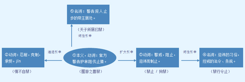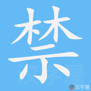 字源解说 禁,篆文 = (林,林野、苑囿)+ (示,使看得清楚、警示),表示警告不可砍伐、狩猎。造字本义:出于对皇家苑囿或特殊林园的保护,而戒阻砍伐或行猎。 附 文言版《説文解字》:禁,吉凶之忌也。从示林聲。 附 白话版《说文解字》:禁,对影响吉凶的忌讳。字形采用“示”作边旁,“林”作声旁。 引申线索