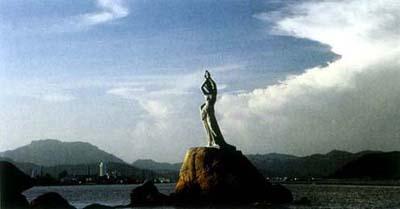 已成为珠海市象征的大型石雕——珠海渔女,位于风景秀丽的香炉湾畔,她风姿优雅,双手高擎著一颗璀璨的珍珠,向世间召示著光明,向人类奉献出珍宝。石雕高87米,重达10吨,用花岗石共70件组合而成。是中国著名雕塑家潘鹤先生,根据一个美丽的民间传说故事创作而成的。
