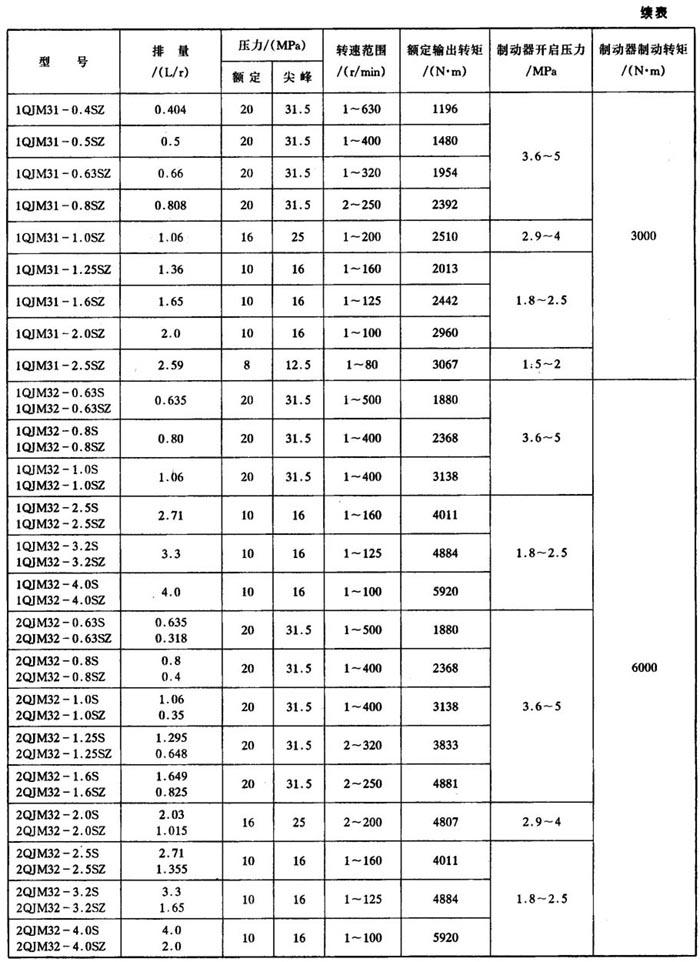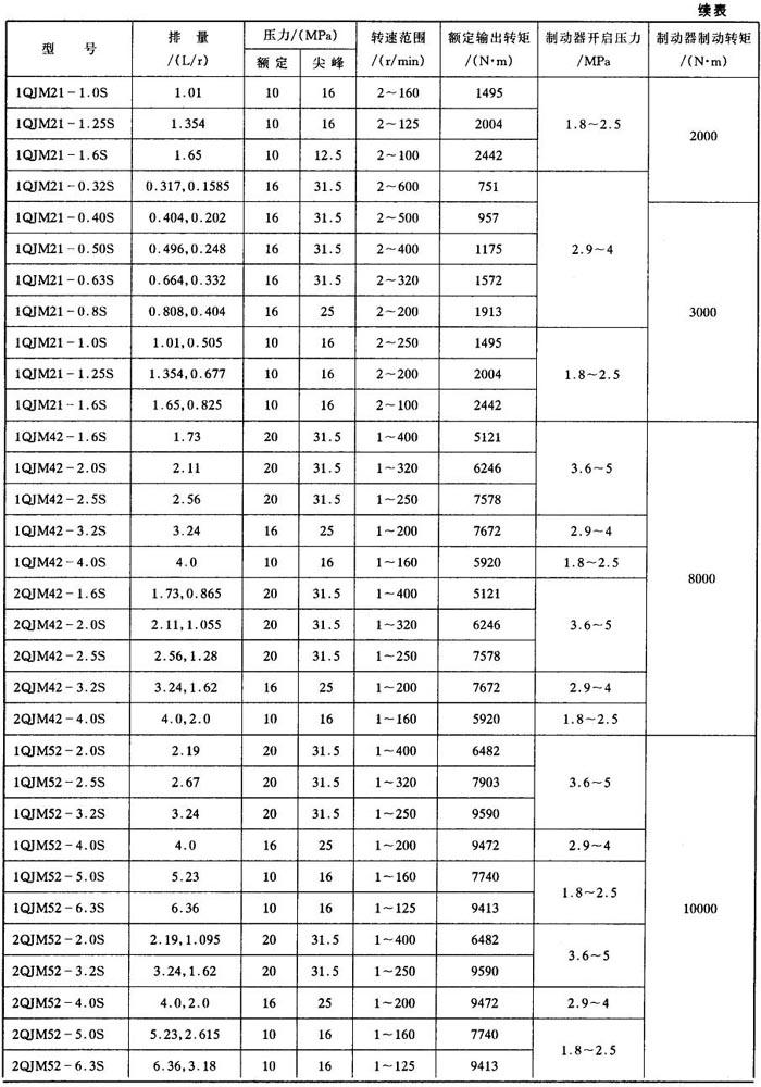 宁波液压马达厂生产。 (1)型号说明  ❶ 排量 1——定量;2——2级变量;3——3级变量 ❷ 变量控制方式:FS-滑阀手动 LS——螺杆手动 无——液控 ❸ 名称:QJM——径向球塞马达(轴转) QKM——径向球塞马达(外壳转) ❹ 基型编号:相同基型时,主要外形尺寸和主要零 件相同。 ❺ 排量数值:L/r ❻ 内花键规格:无——矩形内花键 A——渐开线内花键 ❼ 带附件标记 Z*——带支承,下标为种类 T* *——通孔,下标为通孔直径 B——带转速表座 S——带机械制动器 F——带阀组 (2)性能参数 ❶ QJM型定量马达性能参数见表12.5-10。 表12.5-10 QJM型定量马达性能参数表   ❷ QJM型变量马达性能参数见表12.5-11。 表12.5-11 QJM型变量马达性能参数表   ❸ QJM型带制动器马达性能参数见表12.5-12。 表12.5-12 QJM型带制动器马达性能参数表    ❹ QJM型通孔马达性能参数见表12.5-13。 表12.5-13 QJM型通孔马达性能参数表  ❺ QKM型壳转马达性能参数见表12.5-14。 表12.5-14 QKM型壳转马达性能参数表   QJM型与QKM型马达的外形与安装尺寸,请选用时向厂方索取。 |