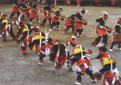 “耍歌堂”节,是广东省连南瑶族自治县、连山瑶族自治县瑶族人民的隆重节日。 “耍歌堂”是瑶语译音,意为庆丰收。也是青年男女对歌觅友的节日。 三五年举行一次,一般在金秋季节10月16日左右。 届时,各村寨的人们、抬著祖先的画像,带著新收获的包谷、红薯和糍粑、米酒、山果等物品,成群结队,翻山越岭,汇集于事先选好的耍歌堂(地势平坦的村寨)。炮响为号,吹响牛角曲。蓄发盘髻、头包红布、插著美丽羽毛的英俊瑶族小伙,在锣鼓声中跳起刚健欢乐的长鼓舞。身著绣有绚丽花朵、纷飞彩蝶、秀丽山河、漂浮彩云的瑶族姑娘翩翩起舞,选择意中人。情投意合者则双双对对离堂而去,在山坡上、树荫下,通过对歌互诉爱慕之情。 其他人或是开怀畅饮、高谈阔论,或是高唱瑶歌、极目远眺,场面十分热闹。 耍歌堂历时3天,第一天是祭祀、游神,将神像临时安放在村中;第二天未婚青年男女成群涌向耍歌堂对唱,成双结对的男女青年相对站立尽情欢唱,从朝至暮;第三天,男女老少浩浩荡荡将神像送回庙里,当夜幕降临时,鼓乐齐鸣,耍歌堂在欢庆的气氛中结束。  瑶族耍歌堂 |