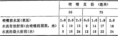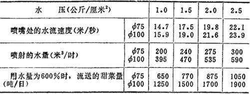 释义 | 甜菜窖与水力冲卸器 1.结构与性能 采用水力冲卸器代替人工下菜时必须设有甜菜窖;甜菜窖还能较集中贮存甜菜,节省占地并便于管理。 利用水力冲卸器冲菜入沟是目前通用而有效的办法,水压不超过3公斤/厘米2,用水量比人工下菜增加30~40%。窖中水力冲卸器间的距离为5~8米(喷出水流超过两个冲卸器间的距离为度)。 窖为长方形,窖宽以5~10米为宜,长度需视甜菜进入方式等而定。窖内堆积高度(无通风)通常不超过四米,窖底坡度为120~150毫米/1000毫米。 2.甜菜窖容积 甜菜窖所需容积可按下式算得: 4.水力冲卸器喷出的水量 水力冲卸器喷出的水量由下式求得: 式中 G——水量(米3/秒) μ——速度系数,同喷嘴的锥角有关,一般为0.9~0.95 ω——喷嘴出口处断面(米2) g——重力加速度,9.81米/秒2 h——喷嘴内的水头(米) 5.水力冲卸器的水流射程 不同喷嘴直径,不同水压时水流射程见表2-4。 表2-4 水力冲卸器的水流射程 6.喷嘴的流送甜菜量 不同喷嘴直径在不同压力下的流送甜菜(未冻)量见表2-5。 表2-5 不同喷嘴直径的生产能力 注:喷嘴出口处冲击力 Φ75——50~140公斤,Φ100——110~300公斤 7.水力冲卸器规格 制糖设备系列化后,水力冲卸器定有下列两种规格,以喷嘴出口直径(毫米)计:50及60。 水力冲卸器规格见表2-6。 表2-6 水力冲卸器规格 |