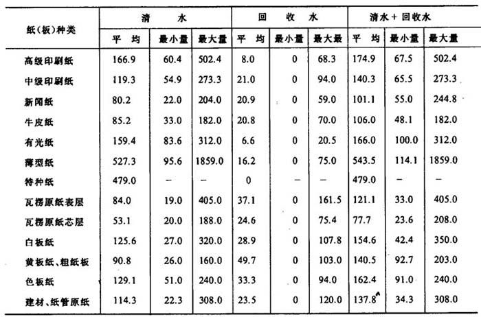 释义 | 生产用水量的确定计算 [说明]确定生产用水量,可以根据浆水平衡计算出的单位耗水量计算出单位时间的用水量(参考浆水平衡的计算);也可参照各生产厂的实际用水定额计算。表4-2-1~表4-2-5列出了国内外不同浆和纸种的生产用水定额,供参考。 表4-2-1 国内纸厂设计用水量定额(m3/t产品) |