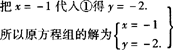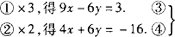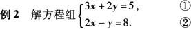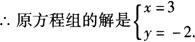 解 ❶ +2×❷ ,得7x=21. x=3. 把x=3代入❷ ,得y=-2. |