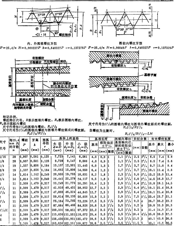 释义 | 用螺纹密封的管螺纹 用螺纹密封的管螺纹见表4.1-29。 表4.1-29 角螺纹密封的管螺纹基本尺寸及公差(摘自GB 7306-87) 注: ❷ 本标准适用于管子、管接头、旋塞、阀门和其它螺纹联接的附件。 ❸ 当内螺纹的结构无螺尾时(空刀槽),有效螺纹的长度不应小于表中最小值的80%。 ❹ 与圆锥外螺纹配合的圆柱内螺纹,其各直径的极限偏差均为圆锥内螺纹基面轴向位移的1/16。 ❺ ※尺寸代号为31/2的螺纹,限用于蒸汽机车。 |