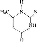 C5H6N2OS=142.18 CAS-56-04-2 2,3-二氢-6-甲基-2-硫代-4(1H)-嘧啶酮。 2,3-Dihydro-6-methyl-2-thioxo-4(1H)-pyrimidinone. 6-甲基-2-硫尿嘧啶。 6-Methyl-2-thiouracil. 抗甲状腺药。抑制甲状腺素合成,用于甲状腺机能亢进及术前准备。 甲硫氧嘧啶。 Methylthiouracil,MTU,Methiacil,Muracin. 甲基硫氧嘧啶片。 INN,BP,DCF,DCIT,GDP,IP,JP,NF,NFN,PH,USAN,USP,USSRP,MI.  |