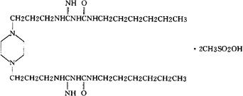 C26H54N10O2·2CH4O3S=730.98 CAS-69017-90-9 CAS-69017-89-6(ipexidine) N,N″-[1,4-哌嗪二基双(3,1-丙(烷)二基亚氨基碳亚氨基)双[N′-己基脲,二甲烷磺酸盐。 N,N″-[1,4-Piperazinediylbis(3,1-propanediyliminocarbonimidoyl)bis[N′-hexylurea,dimethanesulfonate. 1,1′-[1,4-哌嗪二基双(丙三亚甲基亚氨基亚氨羰基]双[3-己基脲]二甲烷磺酸盐。 1,1′-[1,4-Piperazinediylbis(trimethyleneiminoimidocarbonyl)[bis[3-hexylurea]dimethanesulfonate. 防龋齿药。 Ipexidine Mesylate,CK-0569(as the base). INN(Ipexidine),USAN.