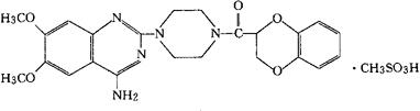 C23H25N5O5·CH4O3S=547.58 CAS-77883-43-3 CAS-74191-85-8(doxazosin) 1-(4-氨基-6,7-二甲氧-2-喹唑啉基)-4-(1,4-苯并二噁烷-2-基羰基)哌嗪甲烷磺酸盐。 1-(4-Amino-6,7-dimethoxy-2-quinazolinyl)-4-(1,4-benzodioxan-2-ylcarbonyl)piperazine methanesulfonate. 抗高血压药。 甲磺酸多沙唑嗪,甲磺酸喹唑嗪。 Doxazosin Mesylate. INN & BAN(Doxazosin),USAN.