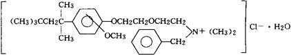 释义 | 甲苄索氯铵 C28H44ClNO2·H2O=480.13 CAS-1320-44-1 CAS-25155-18-4(anhydrous) 氯化N,N-二甲基-N-[2-[2-[甲基-4-(1,1,3,3-四甲基丁基)苯基]乙氧]乙基]-苯-甲烷铵一水化合物。 N,N-Dimethyl-N-[2-[2-[methyl-4-(1,1,3,3-tetramethylbutyl)phenoxy]ethoxy]ethyl]-benzenemethanaminium,chloride,monohydrate. 苄基二甲基[2-[2-[[4-[1,1,3,3-四甲基丁基)甲苯基]氧]乙氧基]乙基]氯化铵一水化合物。 Benzyldimethyl[2-[2-[[4-(1,1,3,3-tetramethylbutyl)tolyl]oxy]ethoxy]ethyl]ammonium chloride monohydrate. 消毒防腐药。 Methylbenzethonium Chloride,Hyseptine,Delavan,Amosept,Bactine. INN,BAN,DCIT,USAN,USP. |