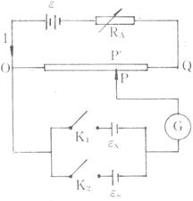 用伏特表测量电路中两点间的电位差及电源的电动势,由于伏特表的分流及电源多少具有一定的内阻,所以测量结果就不那么精确。 为此,比较理想的是利用补偿法来测量。电位差计(电势计)就是利用补偿法进行测量的仪器,其基本原理如下图所示,图中QPO是有精确  刻度的分压器(P是滑动点)。先断开K1接通K2,滑动P至某处P′,使OP′上的压降Vop’与标准电池的电动势εs相等时,即:  这时,通过杄流计的电流应为零,上式中  然后,断开K2,接通K1,滑动P到某处P”,使杄流计中电流为零,此时应有  于是有 在使用仪器时,一般通过调节RA使I为某一固定值,亦即使 ,有某一固定值,于是校正后,可由 直接读出εx。 |