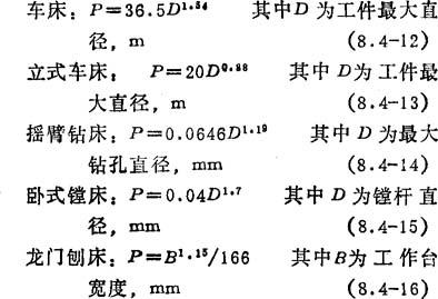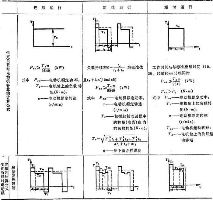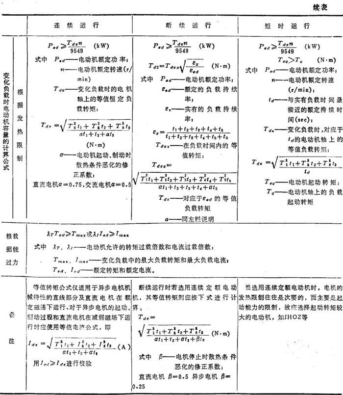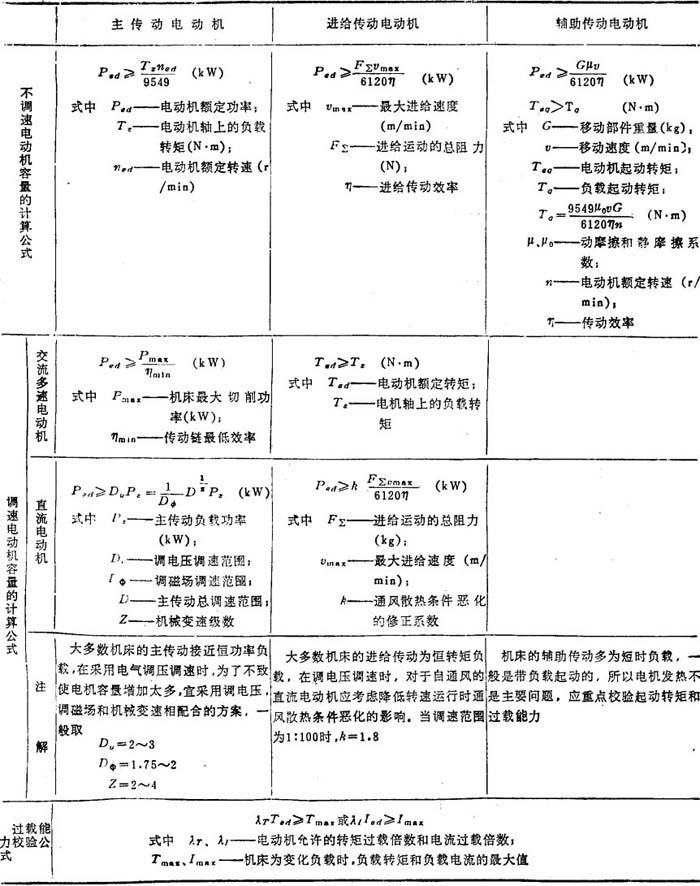 释义 | 电动机容量的确定 电动机的容量可根据生产机械的负载功率选择。电动机的容量与其允许的温升和过载能力有关。一般电动机,在额定负载下长时间工作所达到的温升,即为电动机的允许温升。由于生产机械的负载情况比较复杂,故在实际中,常采用调查统计类比法,或分析和计算相结合的方法,以及节能查表法等,进行电动机容量的选择。 所谓调查统计类比法,就是以一些经过长期运行考验的同类生产机械的电动机容量,进行实测、分析,找出电动机容量与机床主要数据的关系,然后以主要参量、工作条件进行类比,确定电动机的容量。用种这种方法所确定的电动机容量比较符合实际。 机床主电动机容量P,以kW为单位的计算公式为 当机床的主运动和进给运动由同一台电动机驱动时,只计算主运动电动机功率。如果进给运动单独拖动时,进给电动机的功率,车床、钻床为主电动机功率的0.03~0。05,铣床为0.2~0.25。若进给运动由单独电动机驱动,并具有快速移动功能时,电动机功率应按快速移动所需的功率计算,而快速移动所需功率一般由经验数据选择。部分经验数据见表8.4-8。 表8.4-8 驱动机床运动部件的电动机所需功率经验数据 电动机容量的计算与其负载和工作方式有密切关系,各种负载下电动机容量的计算方法见表8.4-9.由表中相应的公式可以看出,Tz为电机轴的负载转矩,如已知工作轴所需的工作转矩或功率,应考虑其传动效率,将其折算到电动机轴。各种传动的效率值可由第一篇表查出。各类机械也有其经验值,例如一般主运动为回转运动的机床传动总效率ηz=0.7~0.85;主运动为往复切削运动的机床为ηz=0.6~0.7(传动机构简单的取大值,复杂的取小值)。 表8.4-9 各种负载下电动机容量的计算方法 当机器的负载为变化负载(包括频繁正反转起动制动)时,应根据负载转矩(或负载电流)及电动机运行情况绘制负载图,按表中公式计算出等值转矩(或电流)和功率来选择电动机,然后再进行容量校验。机床用电动机发热校验和过载能力校验的计算方法见表8.4-10。 表8.4-10 机床用电动机容量的计算公式 |